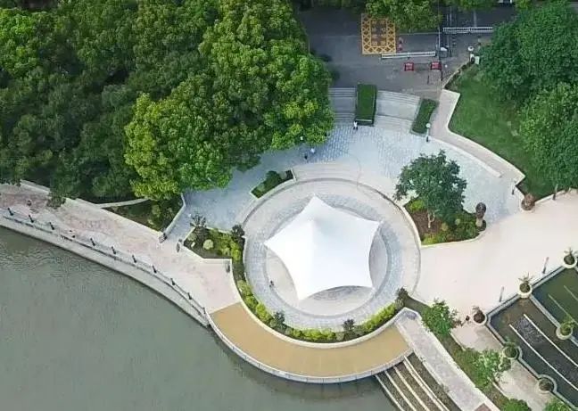 轴线广场,旧年今时。旧时的老码头、圆形广场、大白伞等标志性建筑,承载着无数两湾人的旧年回忆。今时的一河两湾以此为轴不断延伸,颇具线性之美的镂空栈道更为广场增添现代美感。