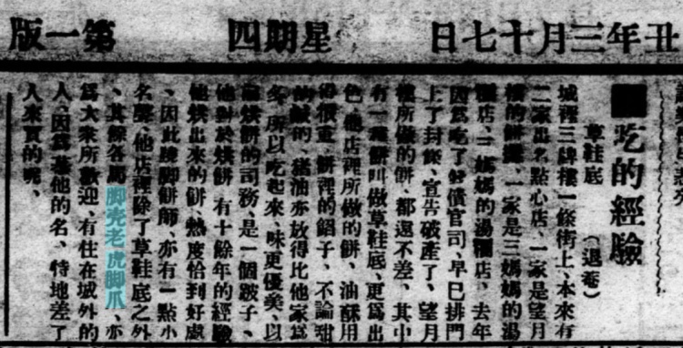 《时事新报》1925年4月9日短文介绍老城厢小吃,提到“老虎脚爪”