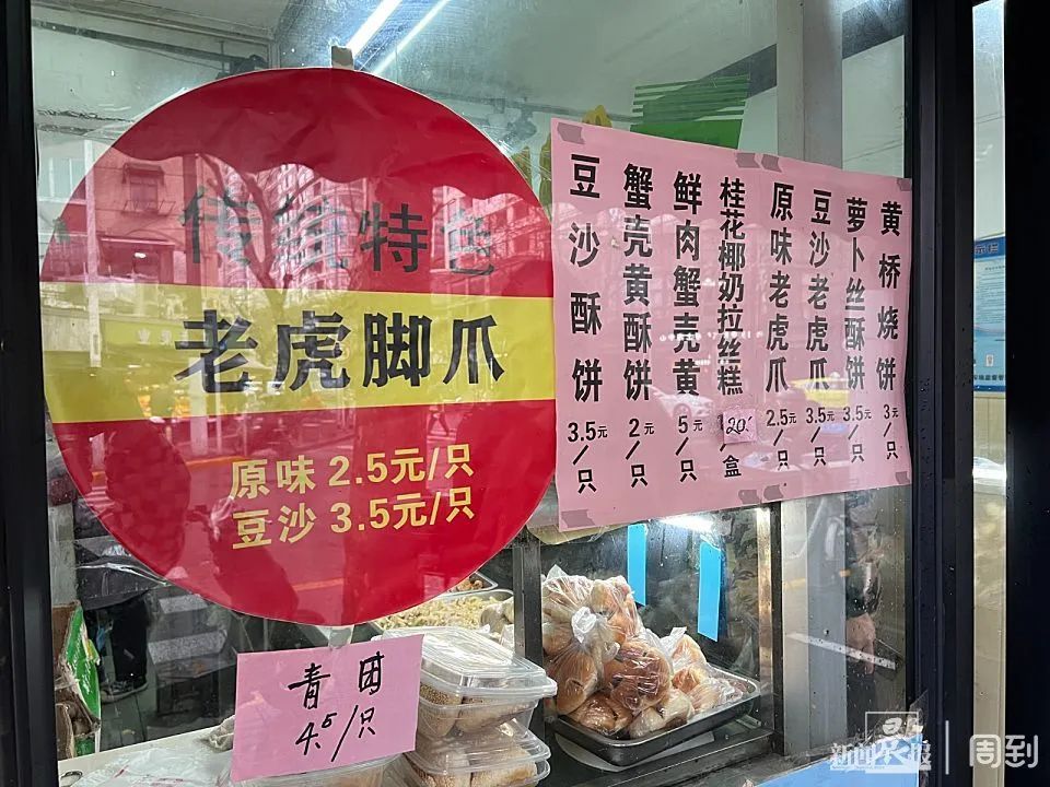 记者在东江阴街菜市场门口找到了找到了市区另一家专门制作老虎脚爪的点心摊头,前有网友将这里称为“老上海心目当中的最后一家老虎爪”,不少市民为了他家的老虎脚爪慕名而来。