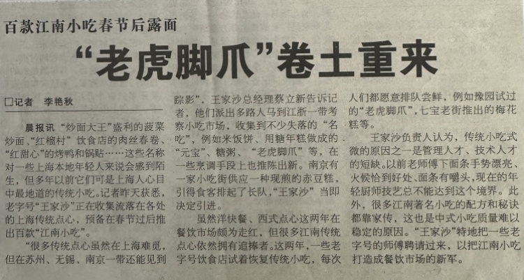 除了王家沙,豫园商城的餐饮部在2006年也推出过老虎脚爪。他们和王家沙遇到了同样的问题,老城隍庙地区文物古迹多,砖木结构房子多,所以用明火烤老虎脚爪,消防安全这道关通不过。如果改用电炉烤老虎脚爪,因为工艺的问题,成品就显得不到位。