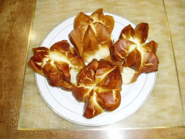 《糕点制作原理与工艺》记载:“京江脐”有“甜”和“咸”两种,均无馅,外形六瓣,故又名老虎脚爪。该产品起源于扬州、镇江一带,历史较久,干食或开水泡食均可。