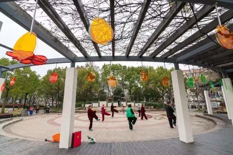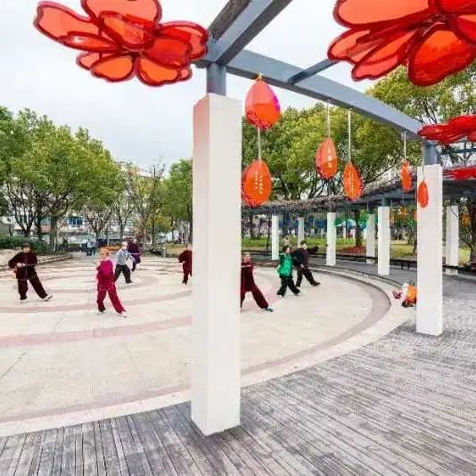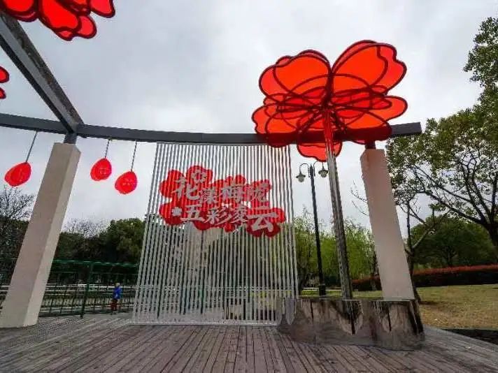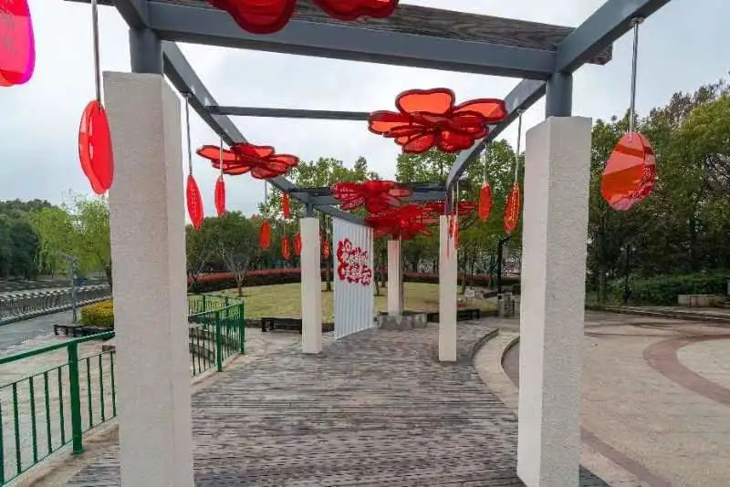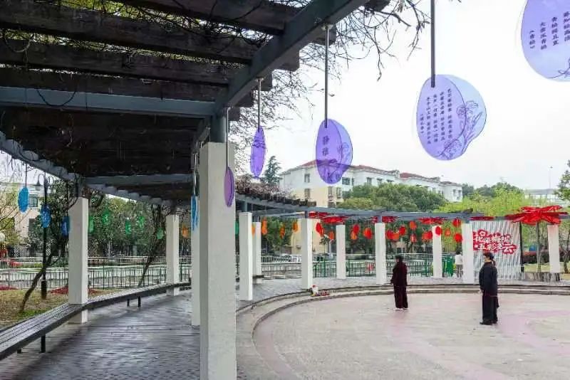 漫步于廊架,人们在如花的诗句中走过四季轮回、岁月更替。花瓣上刻有《咏梅》“宝剑锋从磨砺出,梅花香自苦寒来”等诗句,表达了民族气节,同时也有迎春纳福、万象更新的寓意;春天的桃杏李梨,夏天的石竹(康乃馨)、荷花,秋天的菊花、棉花,冬天的梅松竹柏,在对应的区域依次展开。有些空白没有诗句的花瓣也等待着居民朋友们一起补充。