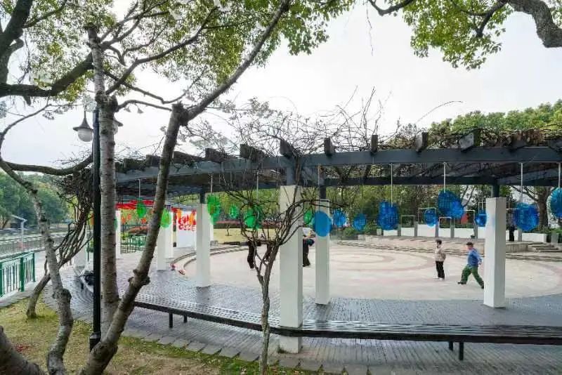 弧形廊架位于公园焦点位置,北临圆形小广场,南侧靠近北潮港。廊架共七个开间(其中五个开间的上空被藤蔓遮蔽),并布置有单侧长凳,是居民社交、休憩的好去处。