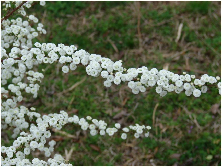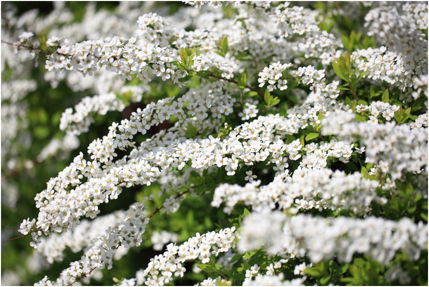 许多公园或者街道景观都种植了这样一种植株,它冬天如同枯枝,但春天一到,就会密密麻麻地开出白色小花,宛如纷飞白雪从冬日穿越到了春光中,再现漫天雪景。这种植物,我们叫它“喷雪花”。