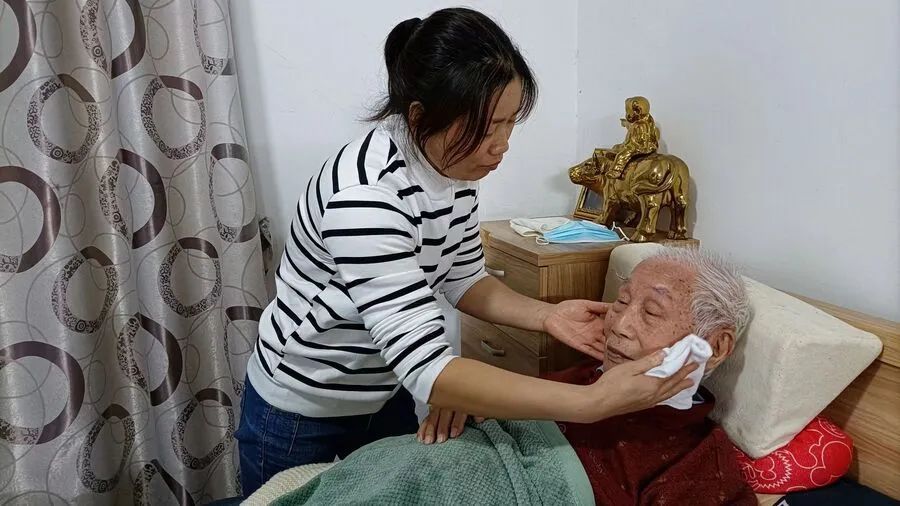 每周三次,“长护险”服务护理人员上门。他们为两位老人提供助浴服务。高阿姨家的居住条件不错,房间宽敞明亮,卫生间也进行了适老化改造,但对于坐着轮椅又上了年纪的老人来说,在没人辅助的情况下,洗澡好比登天难。“家床”的“养老顾问”为他们链接了“长护险”中的助浴服务。在专业护理人员的帮助下,他们现在可以安全地在家洗澡了。