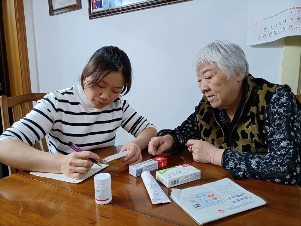 每周一,“家床”的专业护士会按照约定时间上门查看老人的身体情况。根据老人当周的身体情况,指导每日上门的护理员为老人进行下肢康复训练。她还会让两位老人拿出社区卫生中心开好的基础疾病治疗药品,帮助他们将每种药物归纳到药品盒里。每天吃哪种、一次吃多少、什么时间吃,专业护士都归纳得清清楚楚,交代得明明白白。