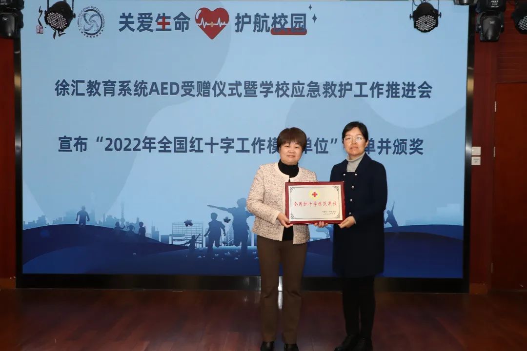 徐汇教育系统AED受赠仪式暨学校应急救护工作推进会3月20日在区青少年活动中心举行,区教育局、区红十字会相关负责人和相关学校代表到场参加。