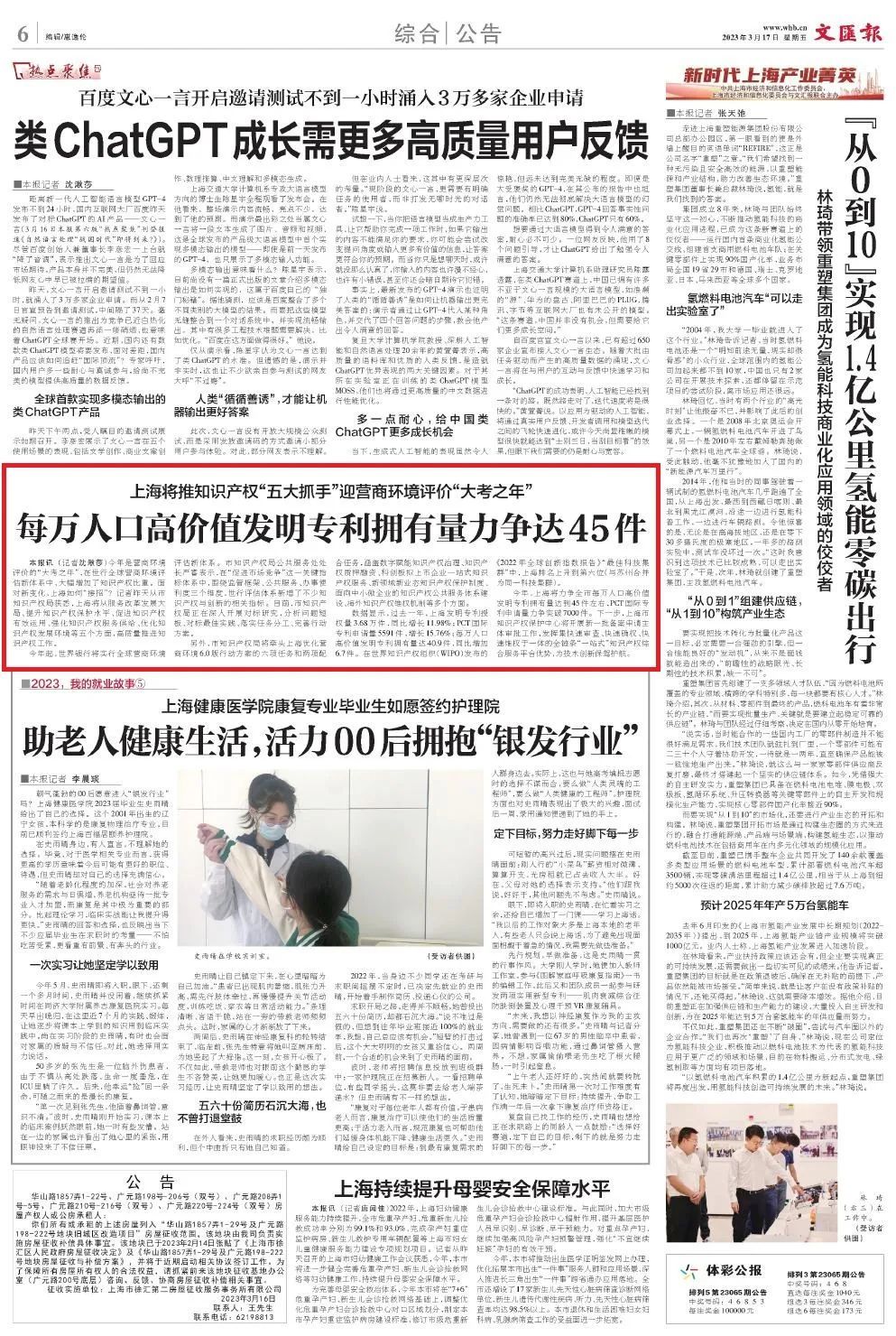 数据显示,过去一年,上海发明专利授权量3.68万件,同比增长11.98%;PCT国际专利申请量5591件,增长15.76%;每万人口高价值发明专利拥有量达40.9件,同比增加6.7件。在世界知识产权组织(WIPO)发布的《2022年全球创新指数报告》“最佳科技集群”中,上海排名上升到第六位(与苏州合并为同一科技集群)。