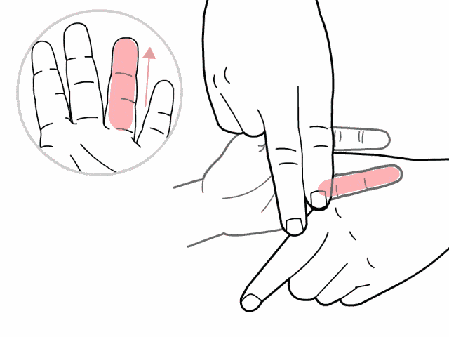 操作方法:用中指和食指指腹在小儿左手无名指自指根向指尖方向直推罗纹面300次。