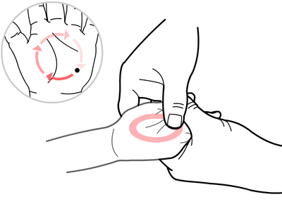 操作方法:以小儿左手内劳宫穴为圆心,从内劳宫穴至中指指根距离的2/3为半径所作圆周,用拇指罗纹面顺时针沿圆周进行推运,操作300次。