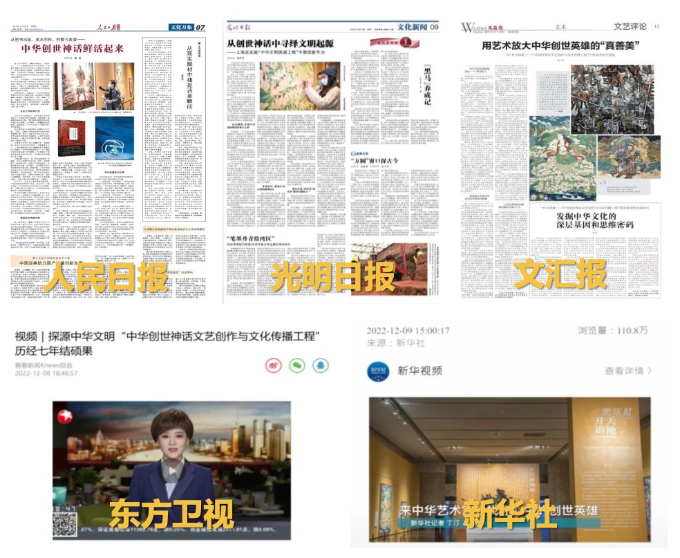 “开天辟地——中华创世神话文艺创作与文化传播工程”成果展的举办,引发人民日报、新华社、光明日报、中新社、解放日报、文汇报、新民晚报、上海广播电视台等30余家中央和省级主流媒体的热情报道,充分挖掘工程成果和展览特色,展现冯远、施大畏等老中青三代艺术家倾情投入的身姿,聚焦少数民族地区艺术家融合生新的文化视角,通过深度报道,保持高曝光度。共刊发各类专题报道百余篇,总阅读量突破1500万。
