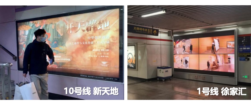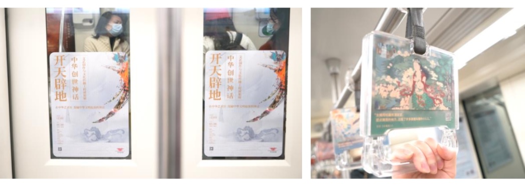 地铁八号线“创世神话”专列开启,车厢的330个拉手和130副车门、车壁被布置上了“创世神话”海报及精选作品图,配合创世神话的英雄故事,邀乘客开启一趟“神话之旅”。更在上海7个核心地铁站(南京东路、静安寺、徐家汇、陕西南路、新天地、人民广场、陆家嘴)投放灯箱广告,以有趣的悬念文案讲述神话故事,吸引观众到馆观展。