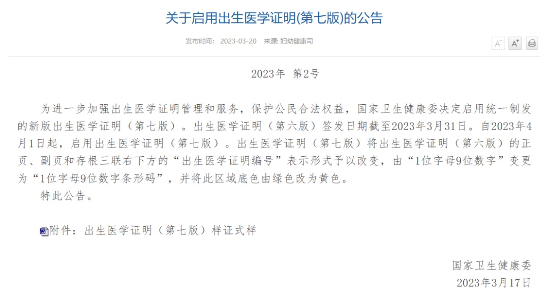 3月20日,国家卫健委网站发布《关于启用出生医学证明(第七版)的公告》,并公布第七版出生医学证明样证式样。
