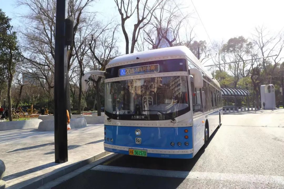 今年三月,公交20路迎来了开线115周年。去年,公交20路换了“新貌”-----全新复古涂装的新型无轨电车上线运行,铛铛声再次回响在上海南京路。因过去其车头悬挂着铜铃铛,只要司机一踩踏板,便发出铛铛声提醒行人注意躲避,非常有特色。