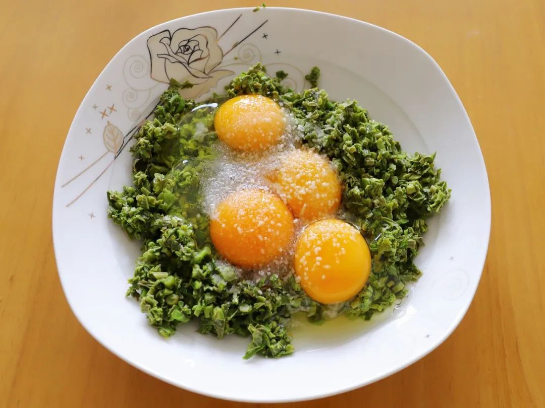 2.在装有香椿头末的碗中打入鸡蛋,加盐、鸡精、白糖,搅匀;