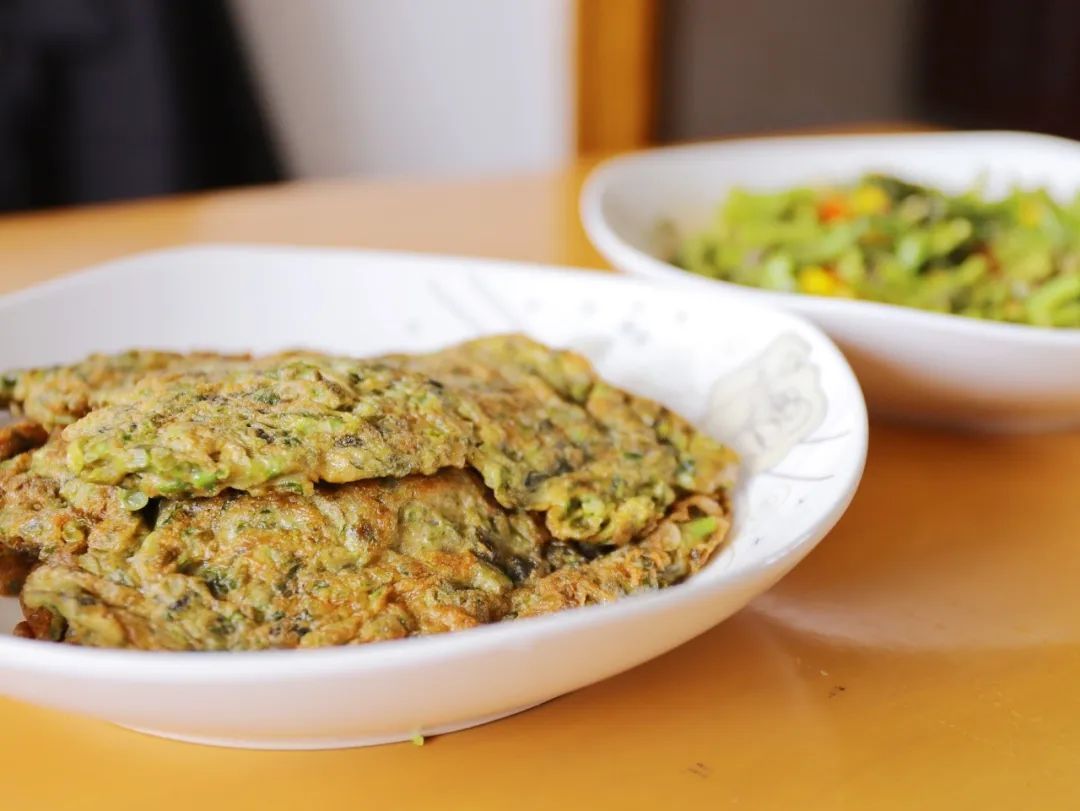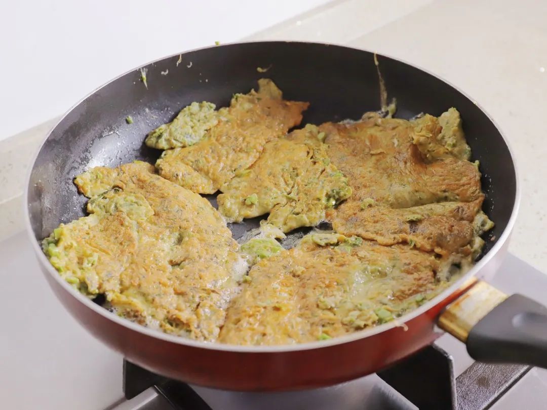 3.锅中倒油烧热后,倒入香椿头蛋液,煎至两面金黄出锅。