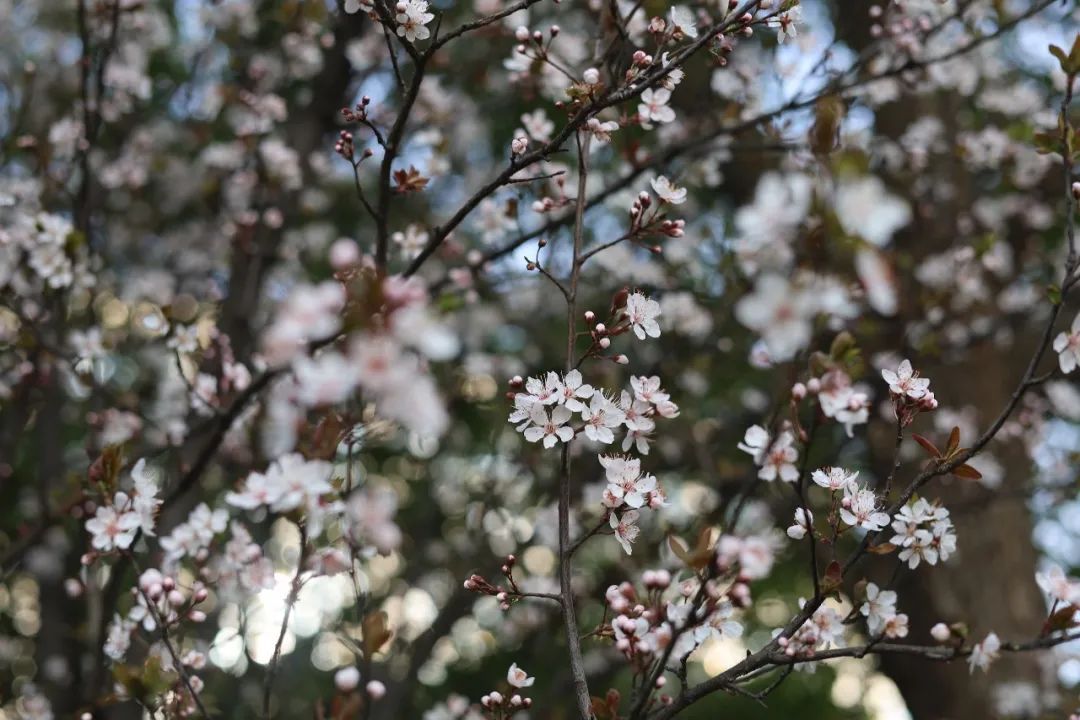 在百花争艳的春天,紫叶李小小的花星星点点,与其说华美,不如说有一种朴素的气息。值得一提的是,今年因为气候原因,紫叶李的花比叶子多,颜值甚于往年。