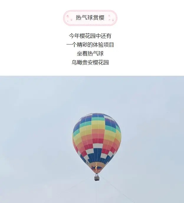 每年3月初到4月上旬,是当地的赏花季。今年3月17日“贵阳发布”的一篇文章显示,今年樱花园中还有一个精彩的体验项目,就是坐着热气球鸟瞰樱花园。