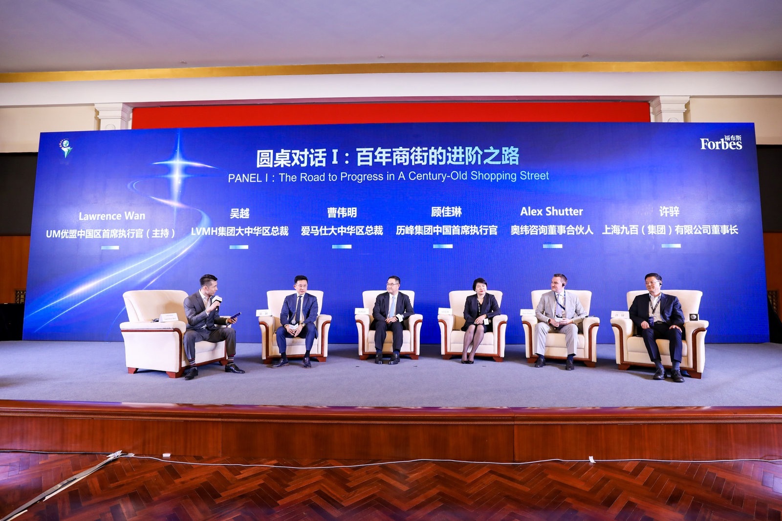 圆桌讨论一由UM优盟中国区首席执行官温道明主持,以“百年商街的进阶之路”为议题,邀请LVMH集团大中华区总裁吴越、历峰集团中国首席执行官顾佳琳、爱马仕集团大中华区总裁曹伟明、奥纬咨询董事合伙人Alex Shutter、南京西路功能区投资服务中心主任许骍,围绕为国际消费中心城市建设共同畅谈和献言百年商街的进阶之道。