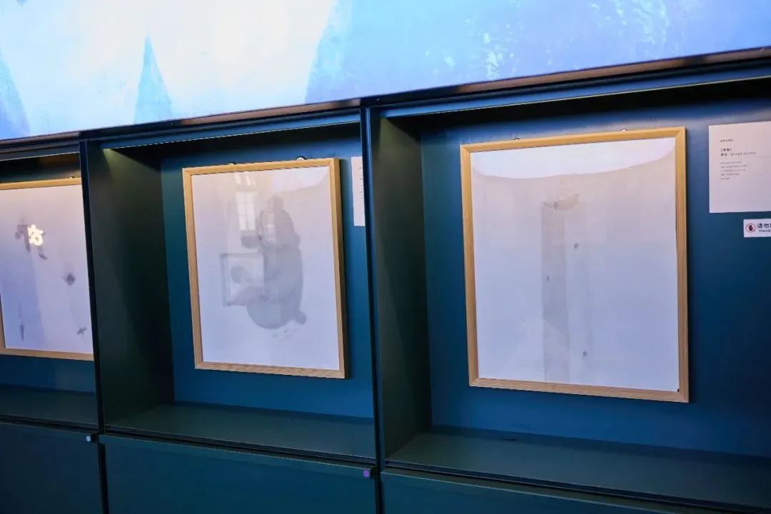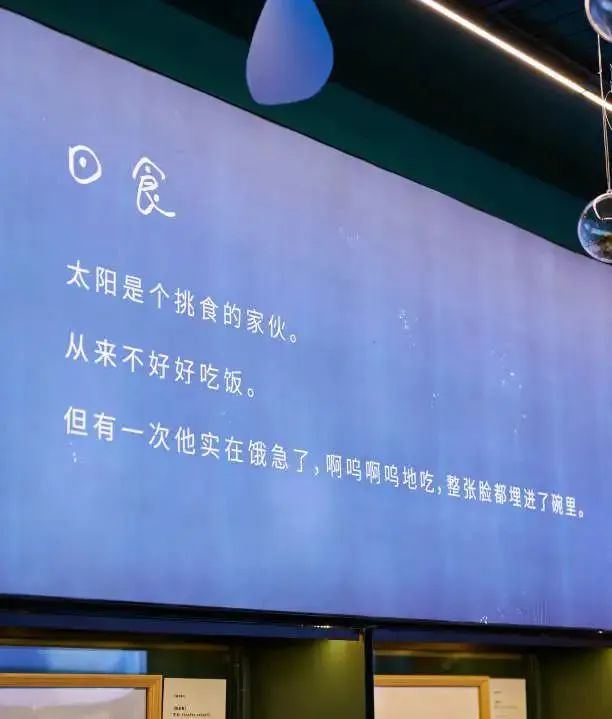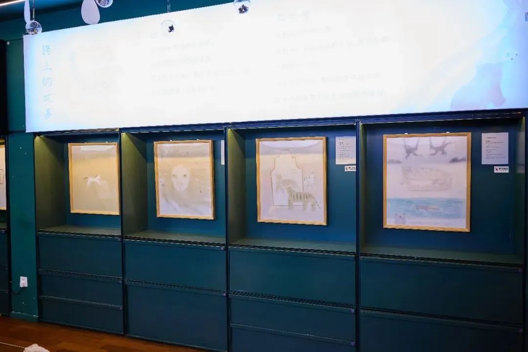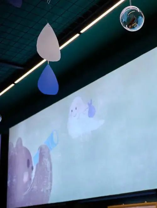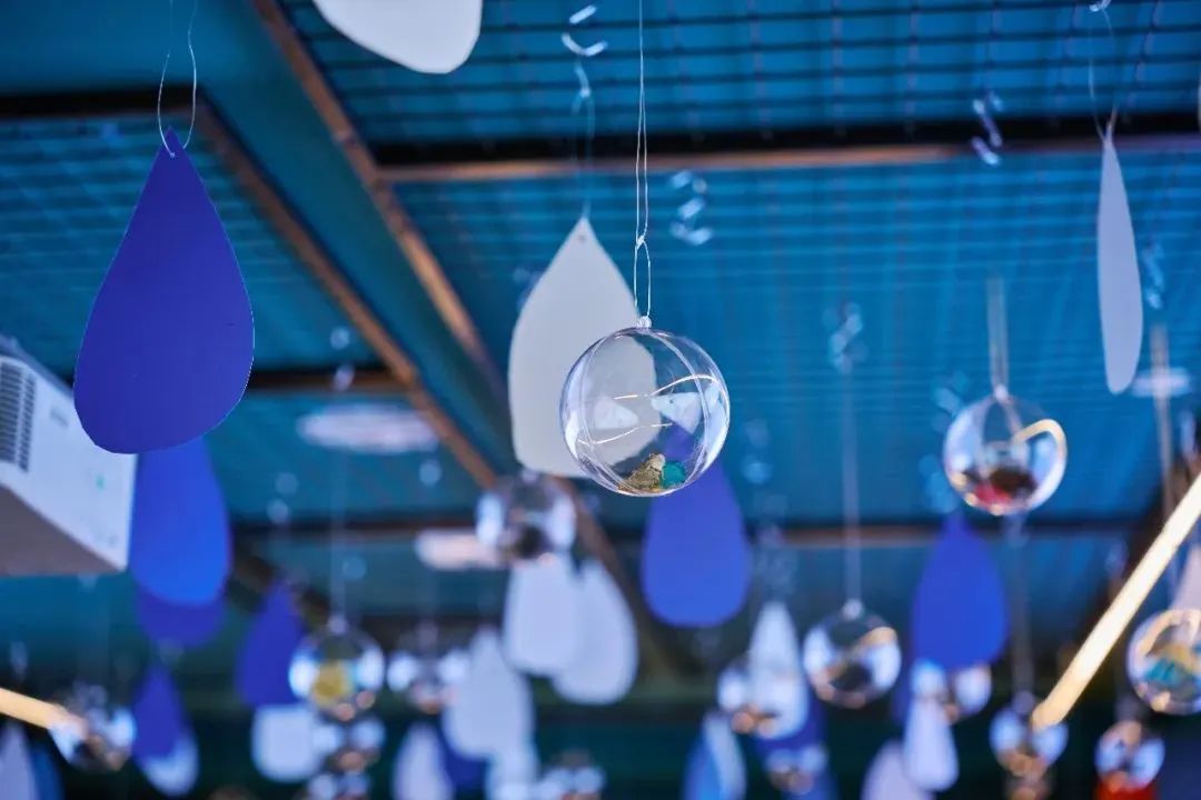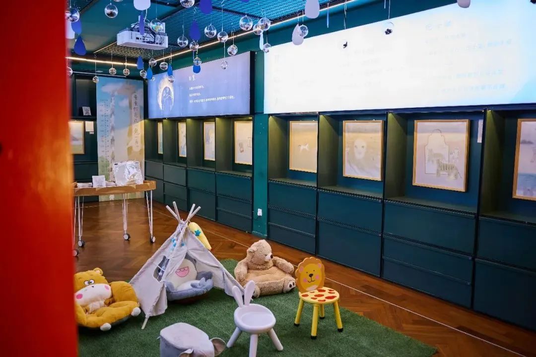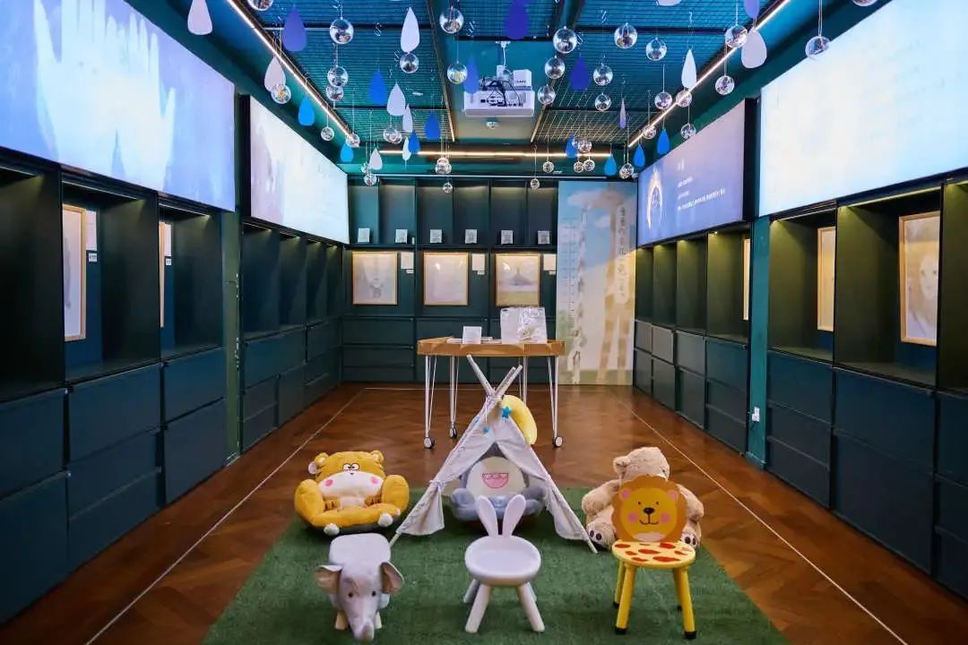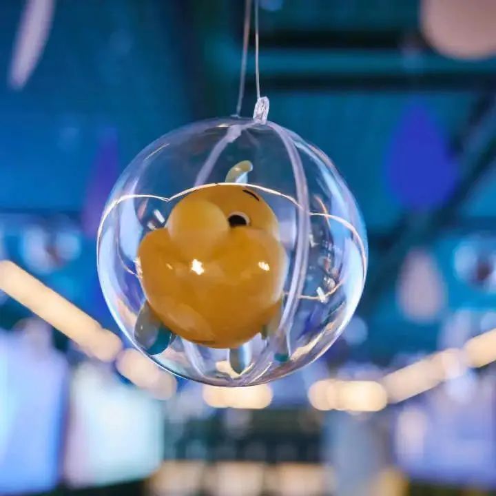 进入思南三楼,抬头就能感受一片童话氛围。展厅顶部悬挂着透明圆球,里面是各种小动物,配合“天空”中蓝白相间的云朵和雨滴,仿佛一群来自遥远想象世界的可爱来客。
