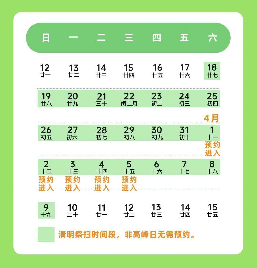 其中,4月1日、2日、3日、4日、5日5个祭扫高峰日实行预约限流。其余时间段无需预约,市民可以合理安排时间提前祭扫、错峰出行。