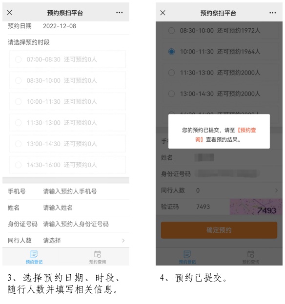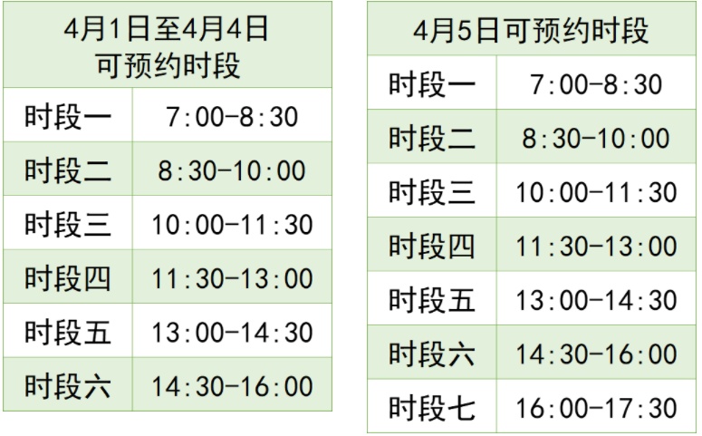 4月1日、2日、3日、4日提供每天6个时段(7:00至16:00、每时段1.5小时)祭扫预约服务;4月5日(正清明)提供7个时段(7:00-17:30、每时段1.5小时)祭扫预约服务。预约成功者最多可携4位亲属同行。