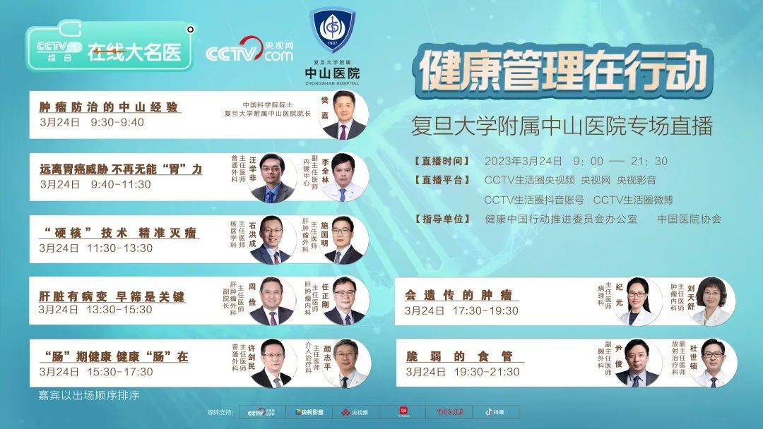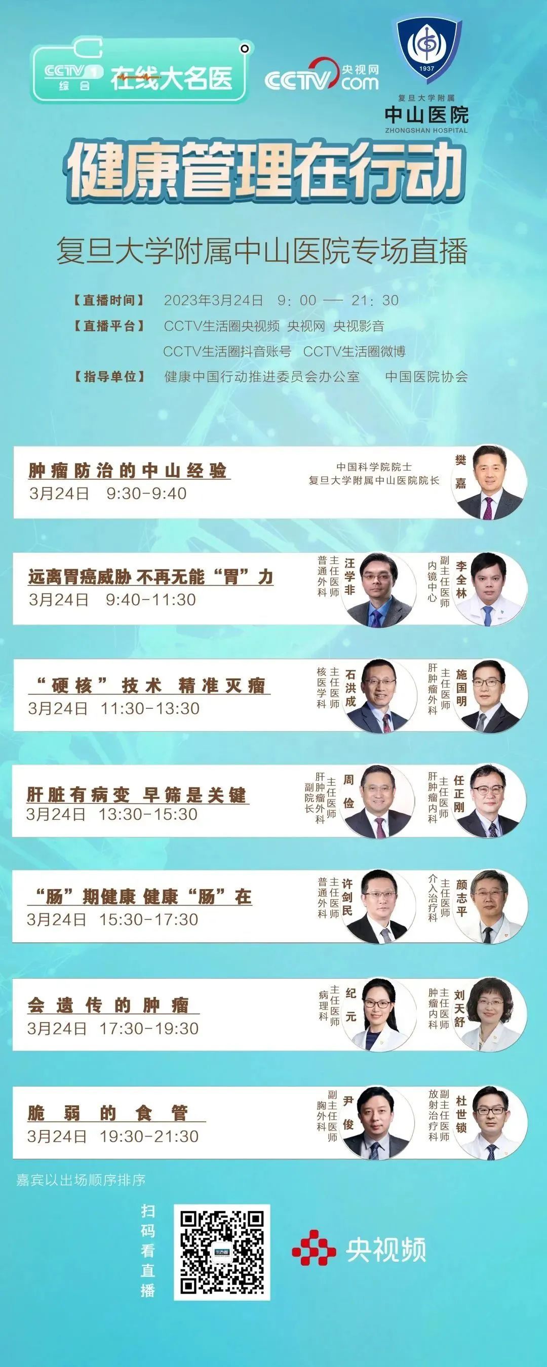 2023年3月24日 9: 00 - 21: 30《在线大名医——健康管理在行动 复旦大学附属中山医院专场直播》邀请中山医院肿瘤诊治领域专家,12小时不间断直播,深入剖析肿瘤防治问题,解读常见疾病误区,更有线上实时互动,与网友“零距离”交流!
