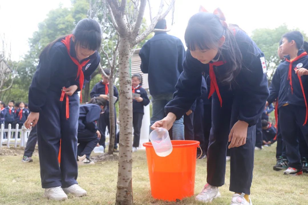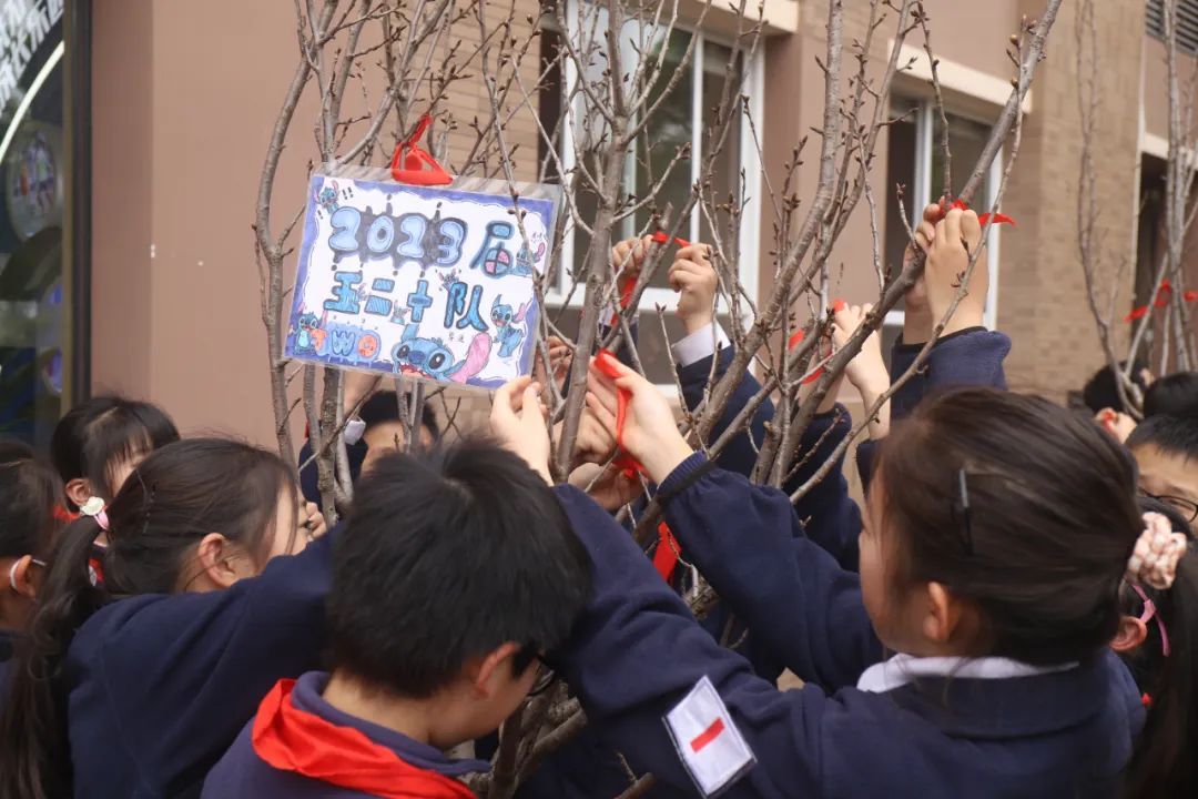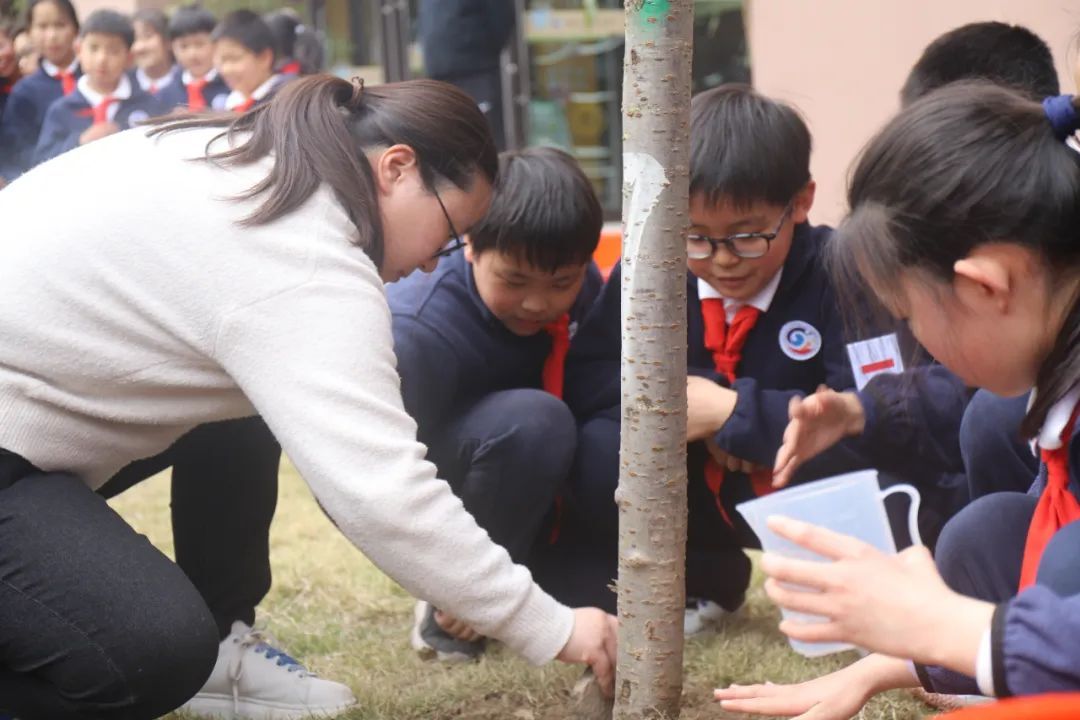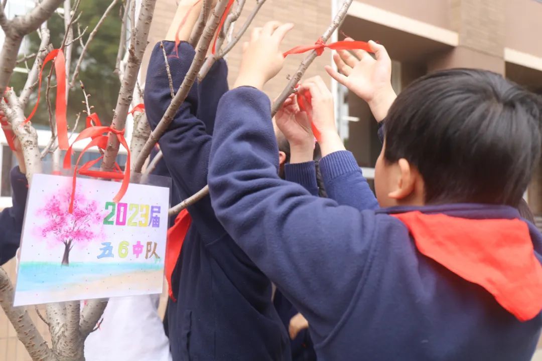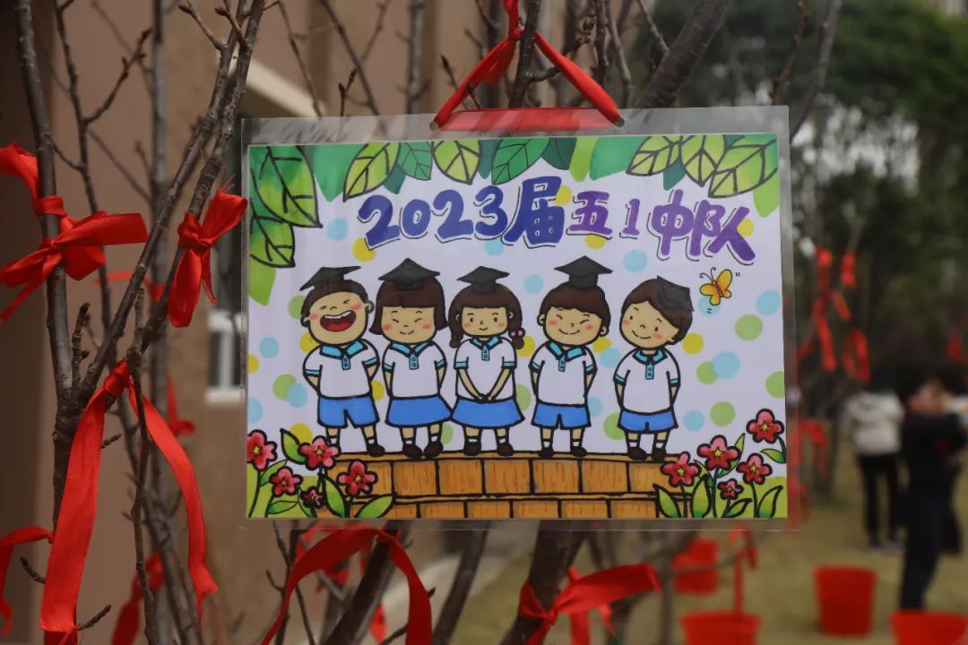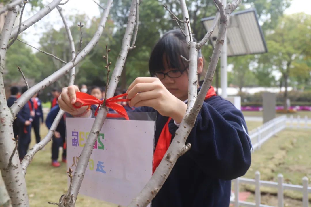 植树完成后,各班都为自己的樱花树苗挂上了精美的班牌,系上一缕红丝带。愿树木抽枝向上、蓬勃生长,成为美丽校园里一道亮丽的风景线。