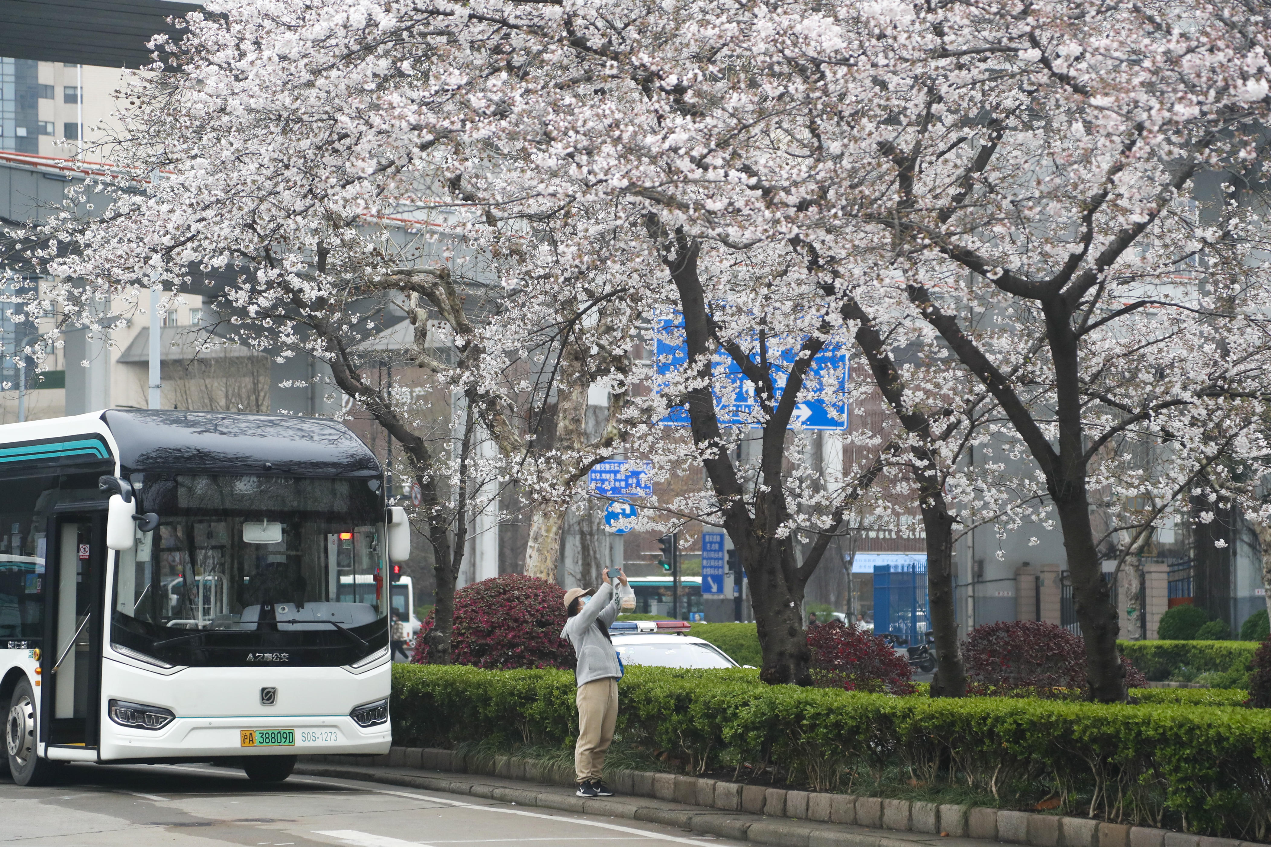 位于南浦大桥公交枢纽的“最美樱花车站”每年都是市民们赏樱的必到打卡地。连日来,43路、65路公交终点站的染井吉野樱花已经陆续绽放枝头。