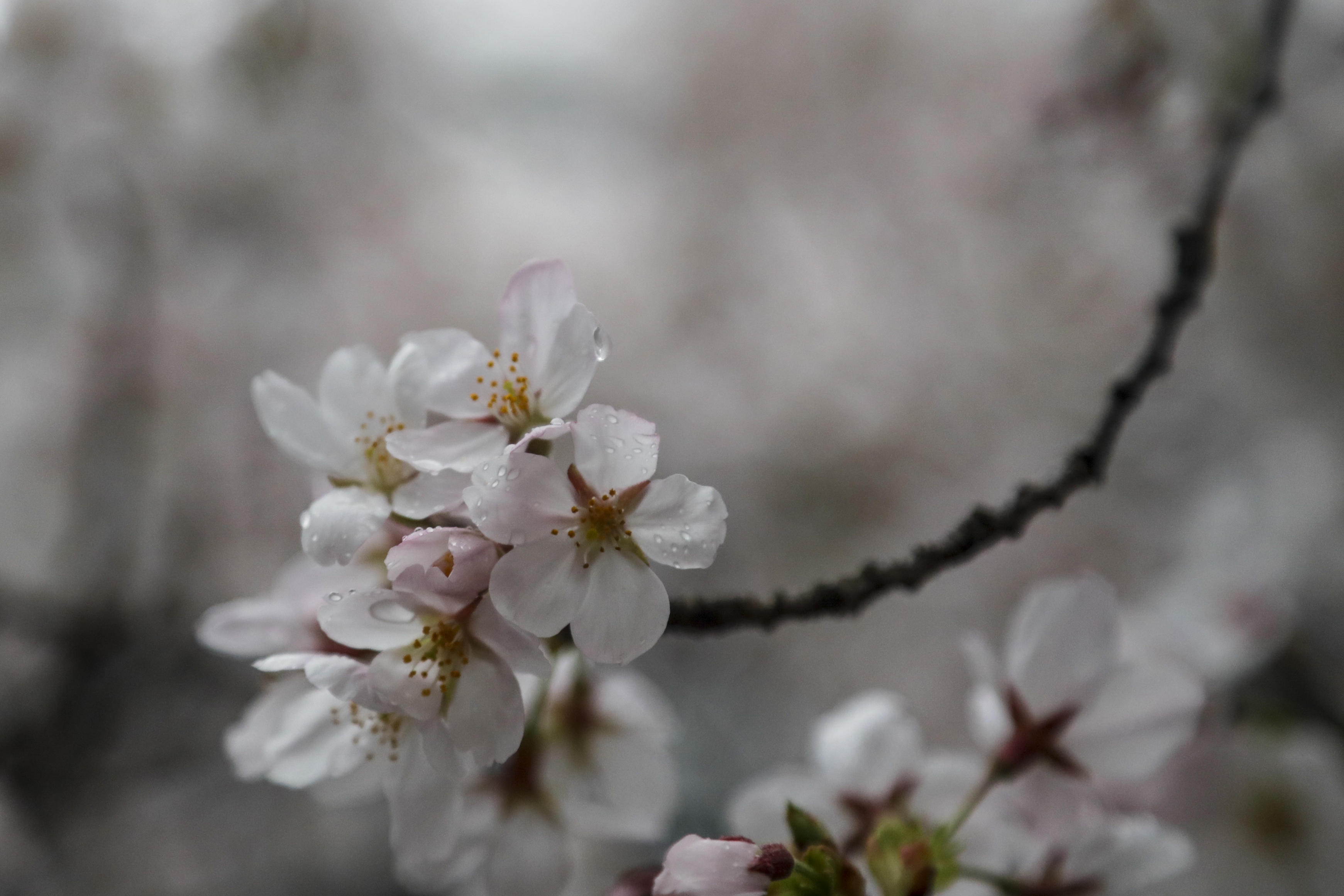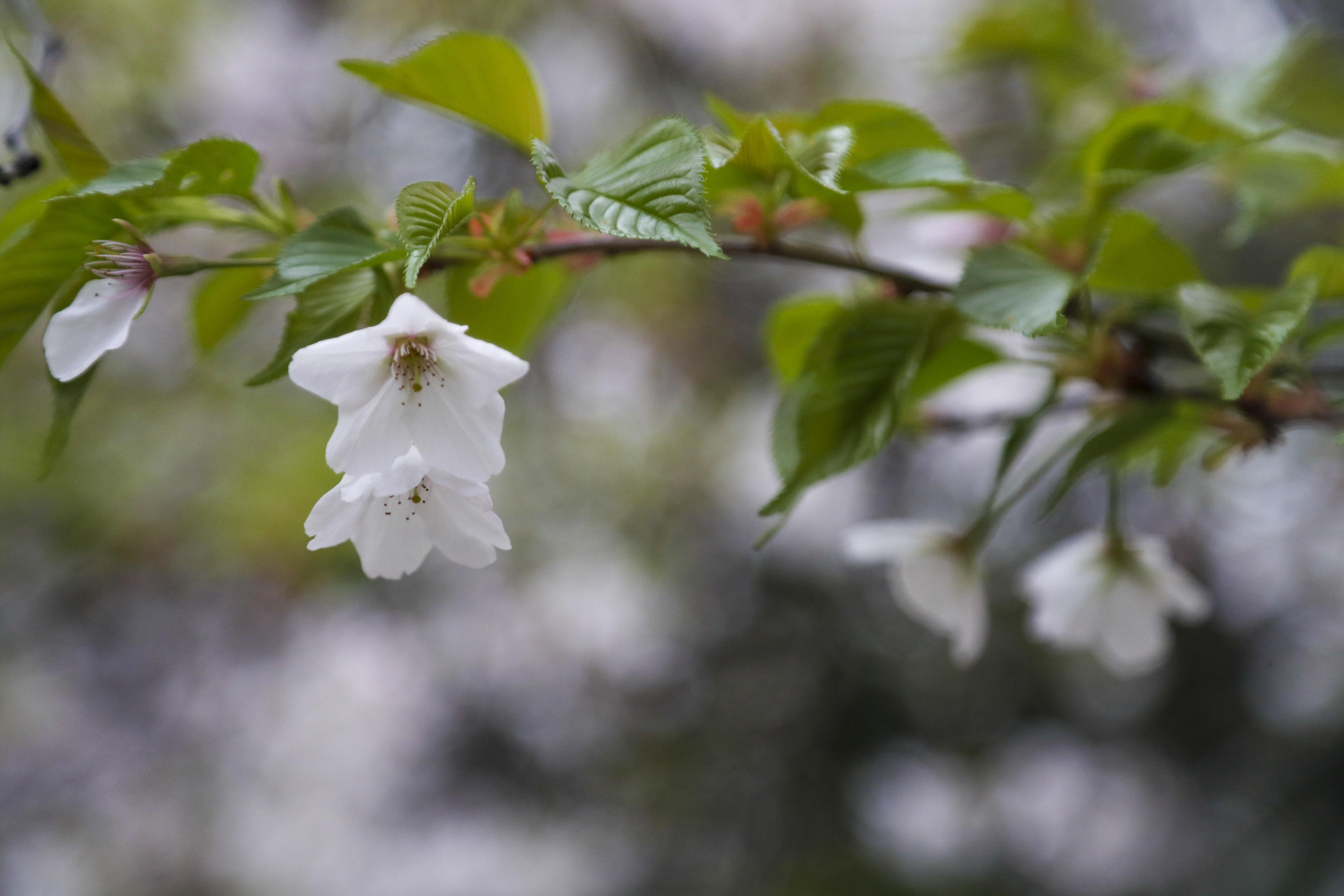 绵绵细雨赋予了赏花人一抹诗意,也让花儿绽放出特有的清新和娇柔,散发着别样的浪漫气息。白色的樱花瓣在雨珠的映衬下更加晶莹剔透,它们随微风细雨飘落,与周围景观相映成趣。除了已经大量盛开的白色樱花外,还有大片的粉色樱花树枝头缀满了“繁星”般的小花苞,含苞待放。