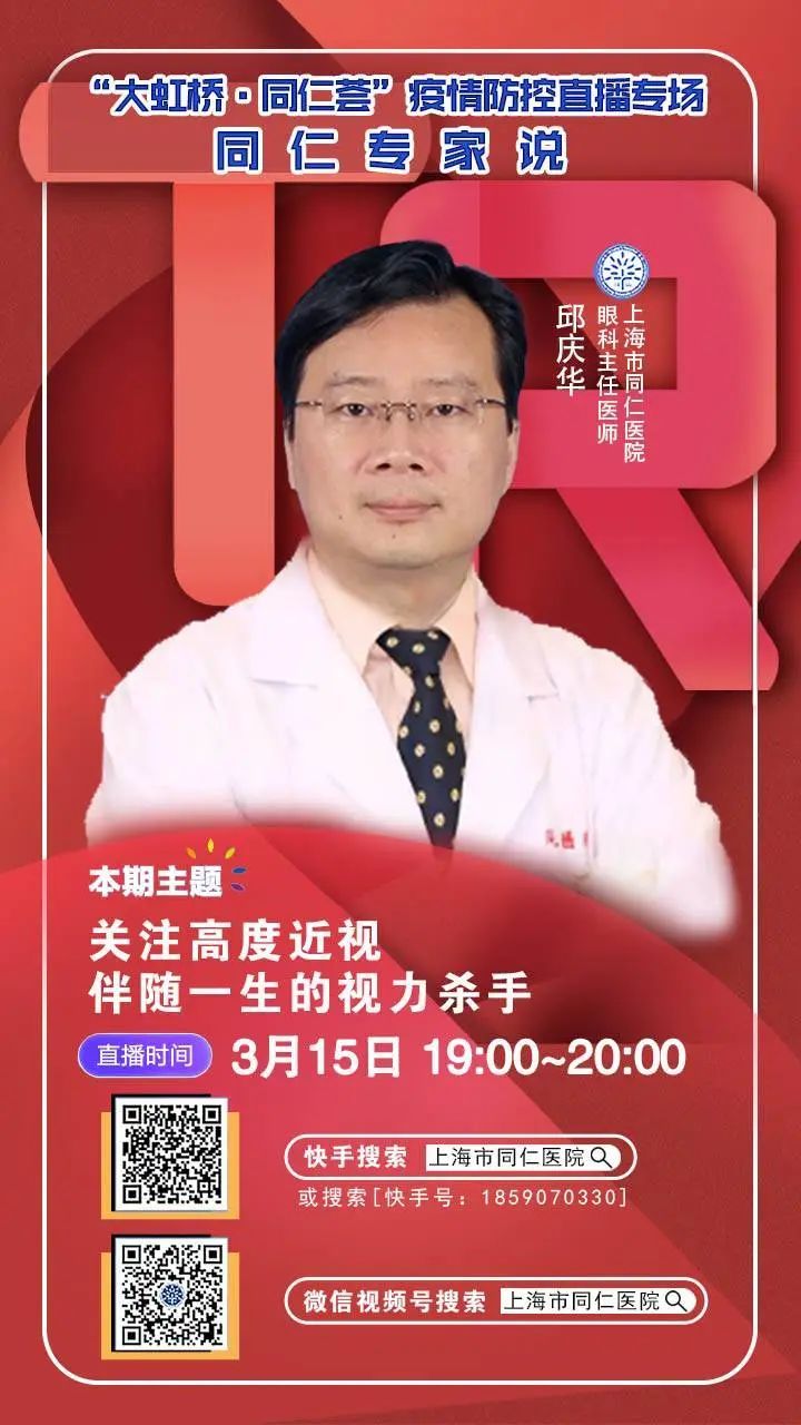 2023年3月15日,“大虹桥·同仁荟”健康直播,眼科专家邱庆华主任,就“关注高度近视,伴随一生的视力杀手”的话题做了详解,听完您就能找到答案哟!