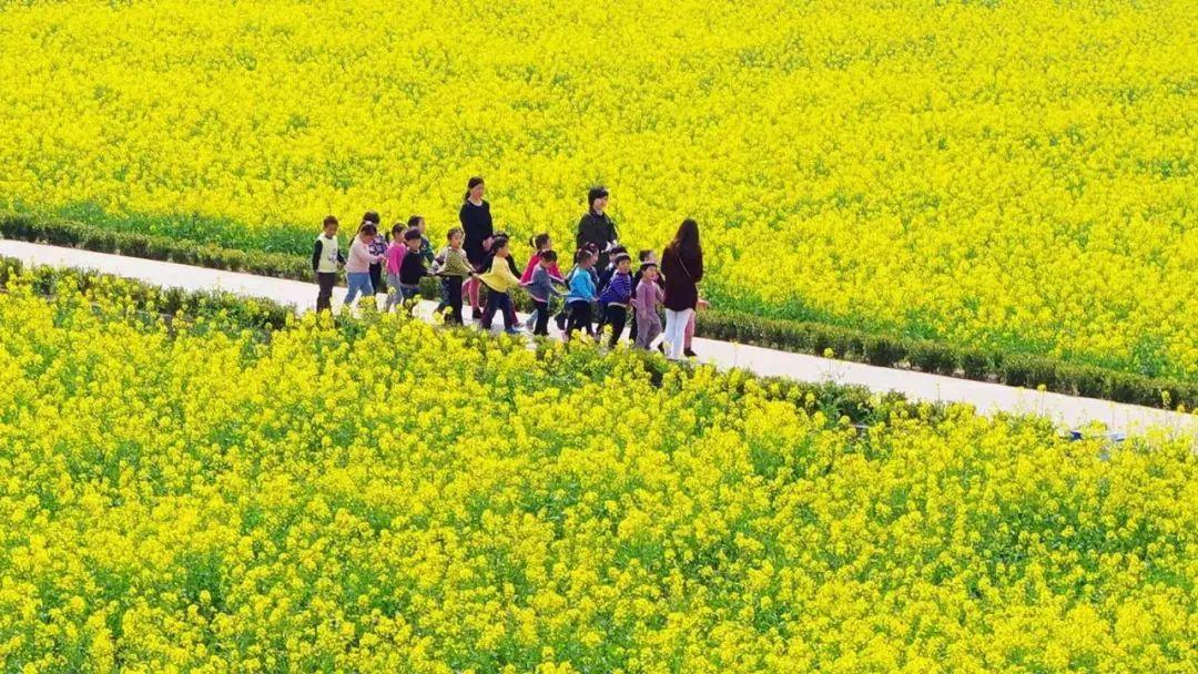 一阵春风温柔地吹来,拂开油菜花海,波纹荡漾,犹如仙境,让人不知今夕何年。也不知是春风眷恋着油菜花,还是油菜花依恋着春风,彼此间难分难舍,缠绵缱绻。躲在油菜花海的怀抱里,被春风吹起的波纹间,深深浅浅,隐隐约约,倒也可以与三五好友在其间捉迷藏,任童趣之心肆意挥洒。“忙趁东风放纸鸢”,三三两两的孩童在花丛中奔忙,争先恐后地让五彩的风筝飞上了天,任童年在空中肆意飞扬。