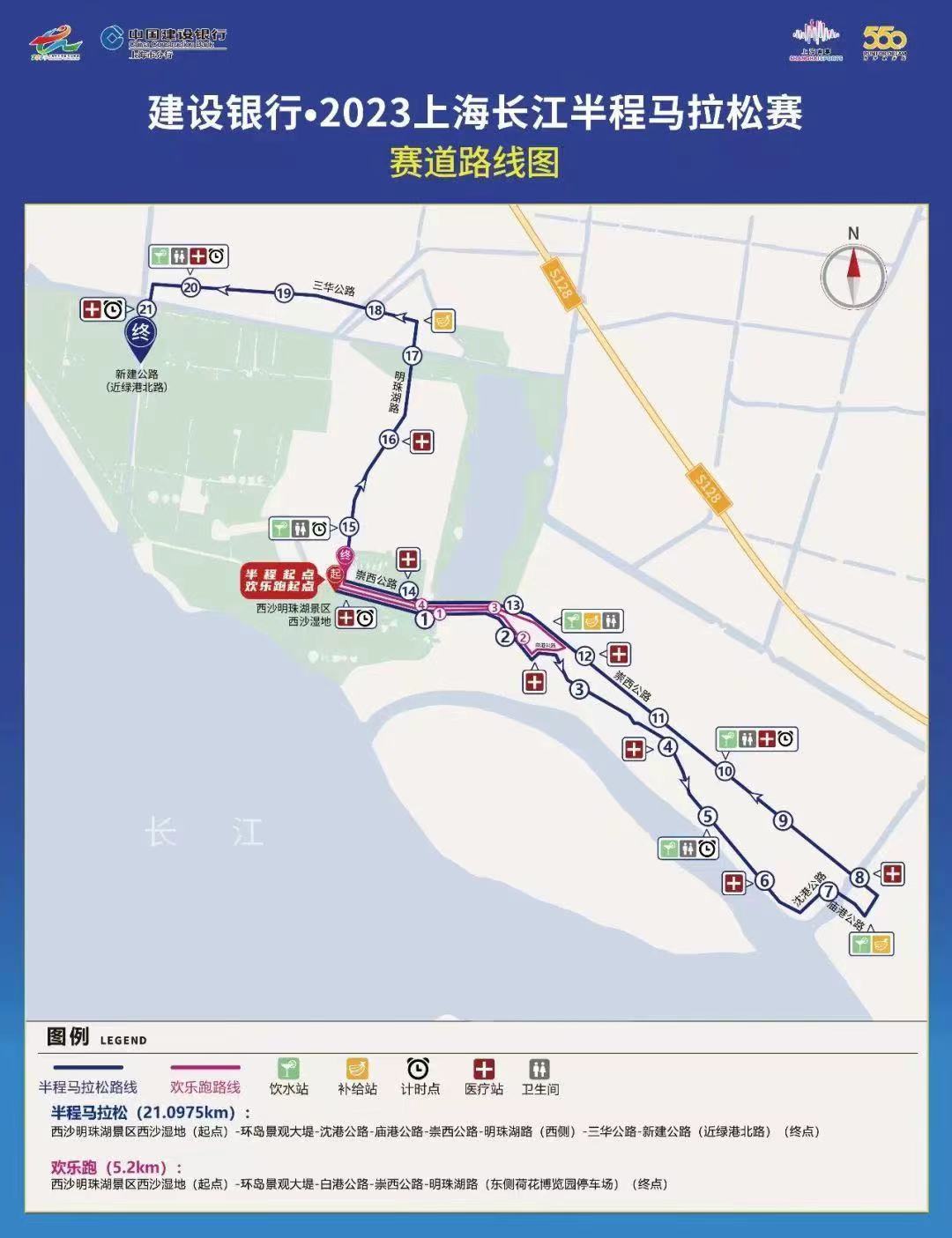 本次比赛设半程马拉松(21.0975公里)和欢乐跑(5.2公里)两个项目,起点均为西沙湿地景区门前大堤处,半程马拉松赛终点在新建公路/绿港北路路口南侧100米处,欢乐跑终点设在新堡路崇西公路路口,发枪时间均为下午14时。赛事期间(下午14时至17时)将在荷花博览园内举办马拉松嘉年华活动,活动包括美食集市、崇明好物展示及相关歌舞表演等。