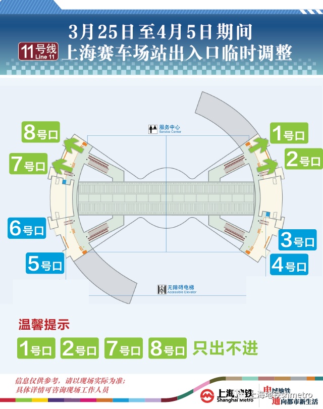 为了加强大客流管控,提高车站现场客流疏散能力,11号线上海赛车场站计划自3月25日至4月5日期间,开启备用的1、2、7、8号出入口,提升车站服务提供能力 。需要提醒的是,上海赛车场站1、2、7、8号口开启期间,实施“只出不进”的管控措施,请乘客听从车站引导。进站乘客请从车站3、4、5、6号口分散向两侧站厅进站。