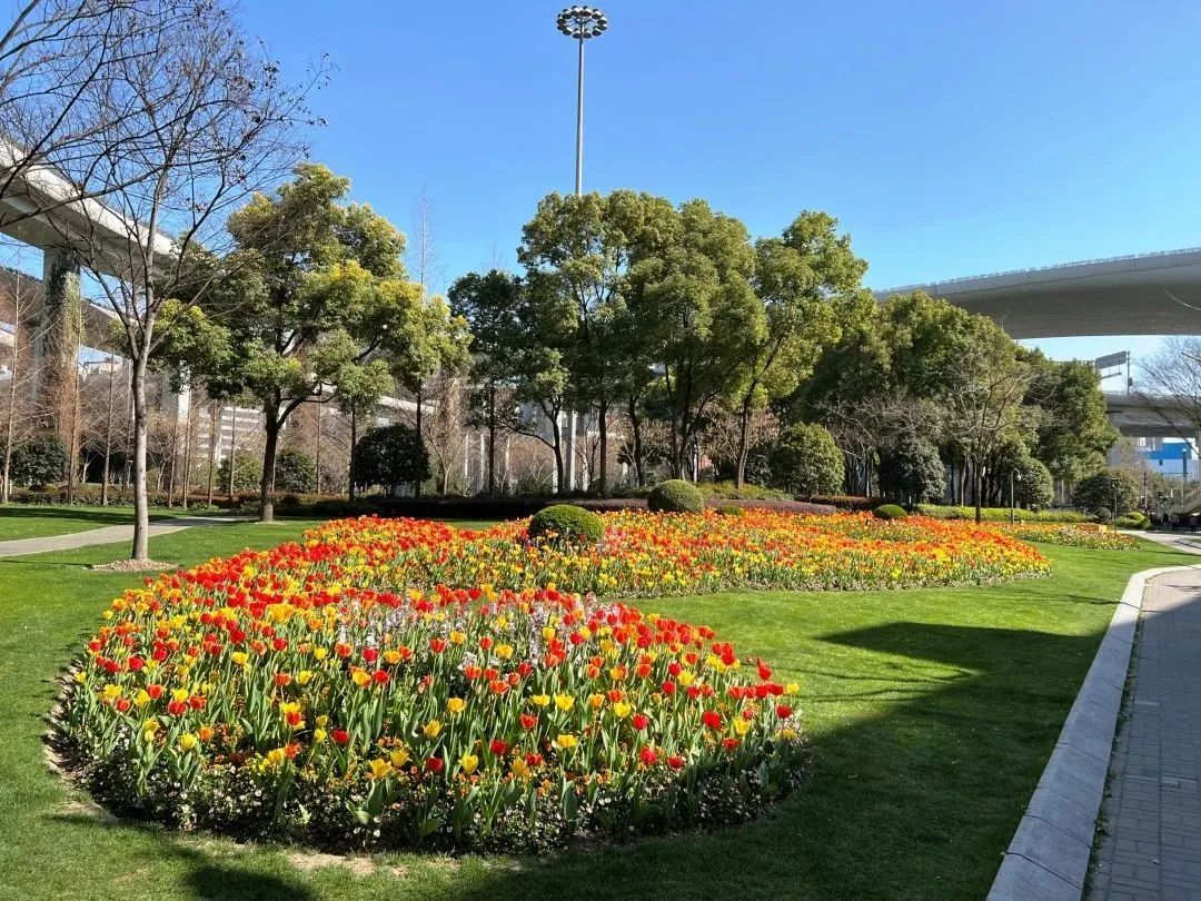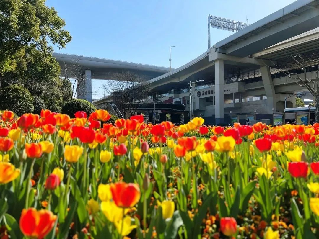 中环公园郁金香采用了红黄相间的花坛主题色彩,为春日的中环增添了一抹明艳。中环公园与汶水路地铁站的交相呼应成为了上海市地铁线路中的一道独特景色,近日来大有“出圈”的趋势。盛开的郁金香也正好为中环公园“登台造势”。