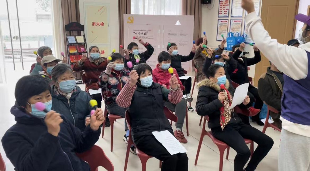 音乐响起,各家庭照料者跟随音乐舞动起来,随后工作人员带着大家一起唱歌,相互对唱。在沙锤律动活动中,大家分为三组,每一组根据歌词摇摆舞动沙锤,跟随音乐的节奏,舞动双手。