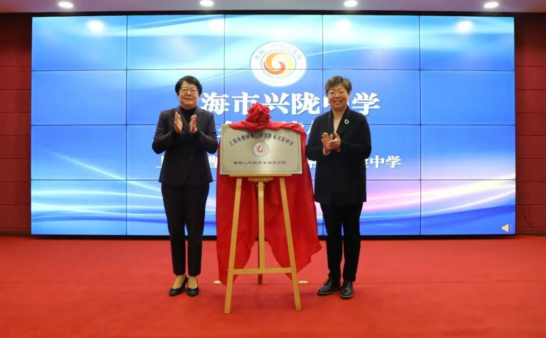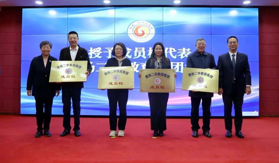 本次会议宣布兴陇中学更名为“上海市曹杨第二中学附属实验中学”(简称“曹二实验”),与会领导共同为新校名揭牌。同时颁发曹杨二中教育集团校总校长聘书,并宣布上海市北海中学、上海市江宁学校、普陀区教育学院附属中学、上海市中远实验学校四所学校加盟曹杨二中教育集团。