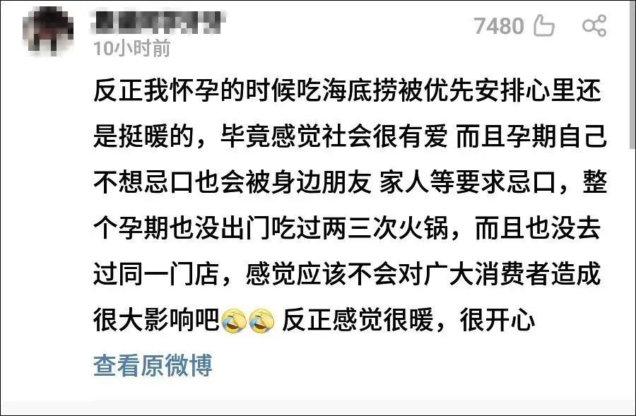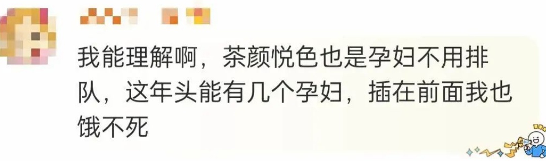 有网友认为,海底捞孕妇插队可以理解,毕竟在坐公交车、饭店等场合都有提示过“老弱病残孕”优先,也有茶颜悦色、喜茶等商家规定了孕妇免排队。