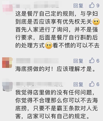 都“有口皆碑”了,海底捞还有啥好遮遮掩掩的了,我就这样干了,就优先安排了怎么了?如果海底捞硬气承认,感觉会被更多人赞扬,毕竟孕妇等弱势群体本该享有更友好对待的优先权。当然,如果它能够明文写出来,大概会让这件好事更没有瑕疵。
