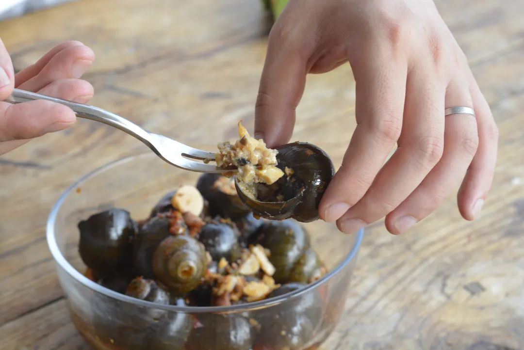 螺蛳的做法太多,最家常的当属酱爆螺蛳。先起热油锅,放入葱、姜炒香,再倒入清洗干净的螺蛳,加生抽、料酒、八角、食盐等一起爆炒,最后加白糖收汁,如果有条件再加骨头汤焖一下,更能鲜到掉眉毛。这道菜的烹饪诀窍在于控制火候,火候不够,则肉生有腥味,火候太过,则易老不鲜美。上盘的酱爆螺蛳鲜香滚烫、浓油赤酱,大人小孩,人手一碗。螺蛳被我家乡人称作“罐头笃肉”,螺蛳壳像极一个微型罐头,里头煲着一盅,有汤有肉,形象至极。我江南多“嗦螺”高手,用三个指头捏住螺蛳壳固定,挑去螺蛳盖,对准螺蛳口一嘬、一咬,劲道鲜嫩的螺肉裹和着汤汁应声入口,“嘬”的妙处便在这连汤带肉一口闷。不过,这看似简单的吃法,也是一门“功夫绝活”。用舌头顶住螺口一吮,其用力之妙,可谓“存乎一心”,气力过猛,会把螺肠也一道吸入嘴里,力道不足,则左嘬右嘬都嘬不上来。《舌尖上的中国》总导演陈晓卿在他的《至味在人间》一书中写道:“同桌一位当地的女性同行,伸出纤纤玉手,用前三个指头拈住一颗螺蛳,轻轻靠近唇边,两颊微微一颤,指尖便只剩下一只空壳……整个过程就像打了一个飞吻,轻佻又不失优雅……”能把嗦螺嗦成“打啵”,这手“嗦”的功夫已然至臻化境。我学会了“嗦螺蛳”,浑然顾不得体面,在一阵“嗦嗦”声中,嘬出了肥美的螺肉,嘬出了鲜浓的螺汤,一颗接一颗,嗦得有滋有味,啜得一手汤汁,“生是一碗,熟是一碗;不吃是一碗,吃了还是一碗”,这是我家乡描写螺蛳的童谣,吃完螺蛳,把剩下的汤汁倒入米饭,拌一拌,下饭得很。