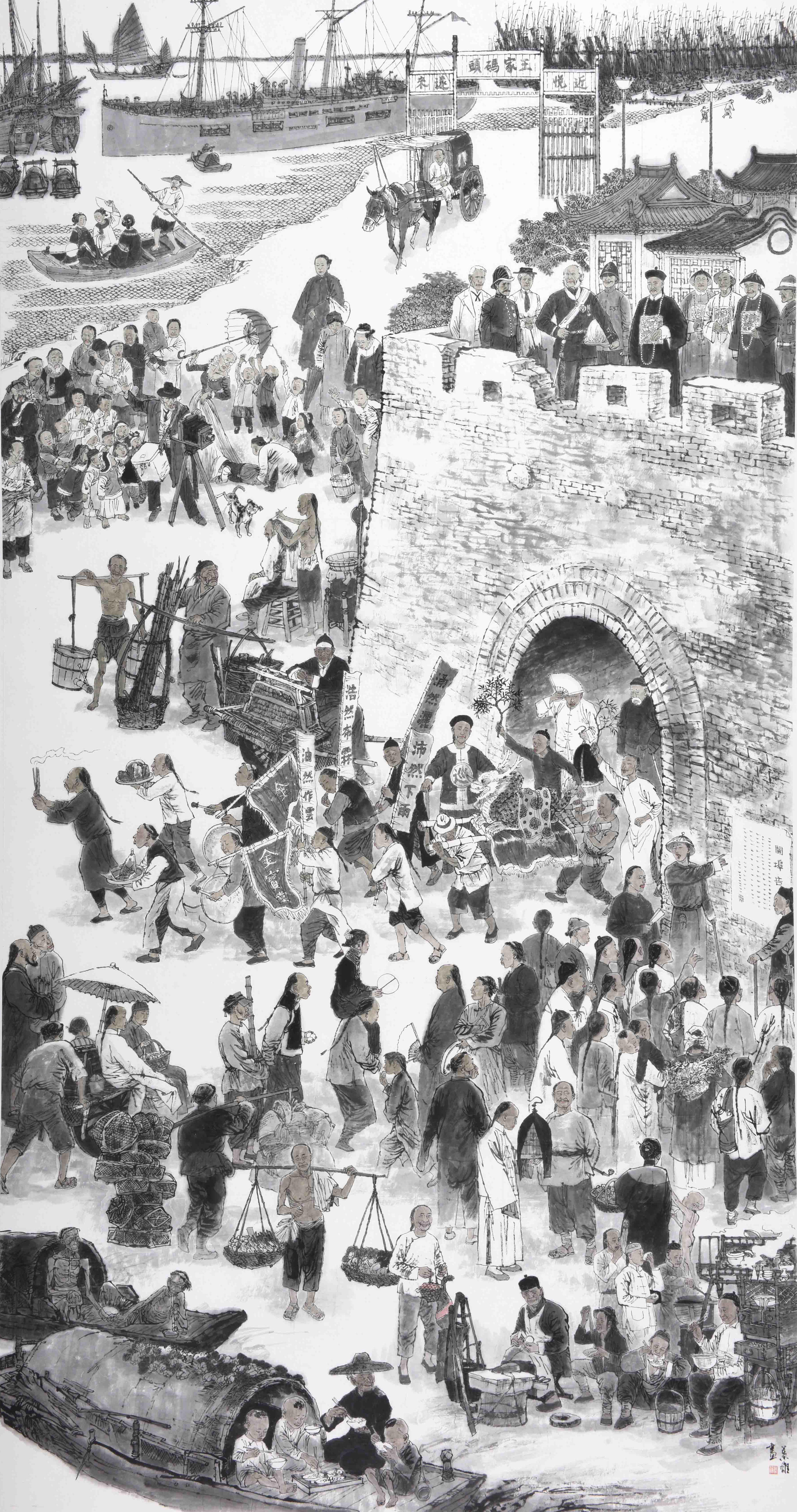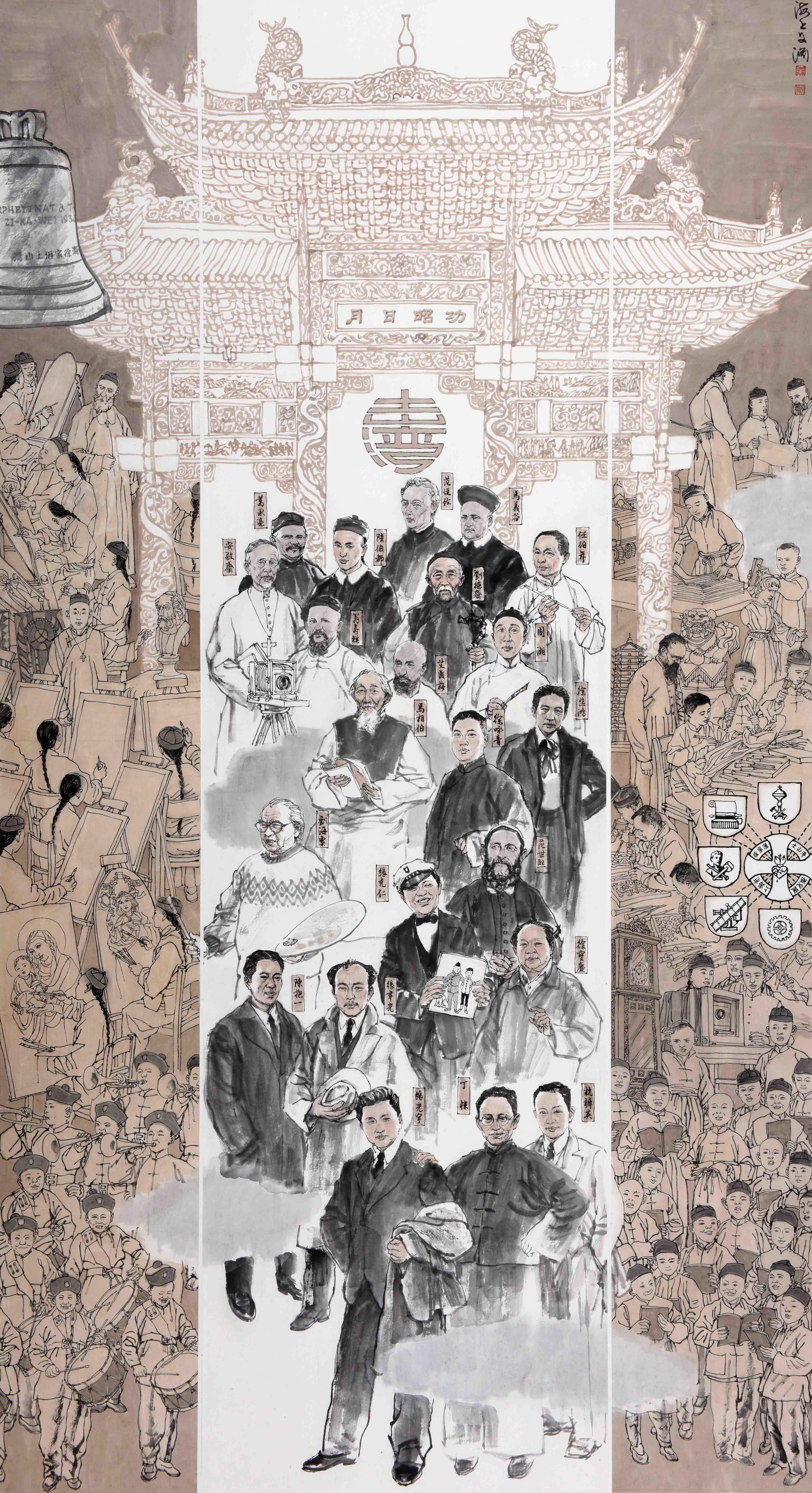 近年来,上海人物画苑的艺术家们悉心研究,用画笔梳理和驻留上海开埠的“历史回声”,至今已创作25幅大型主题创作画,叶雄的中国画《上海滩开埠》用滨江、城墙大视野进行历史回眸;忻秉勇的中国画《江南制造局》用现代人的视角还原中国制造的缩影;奚文渊的中国画《土山湾》以三联画的形式展示土山湾画馆的百年历史……