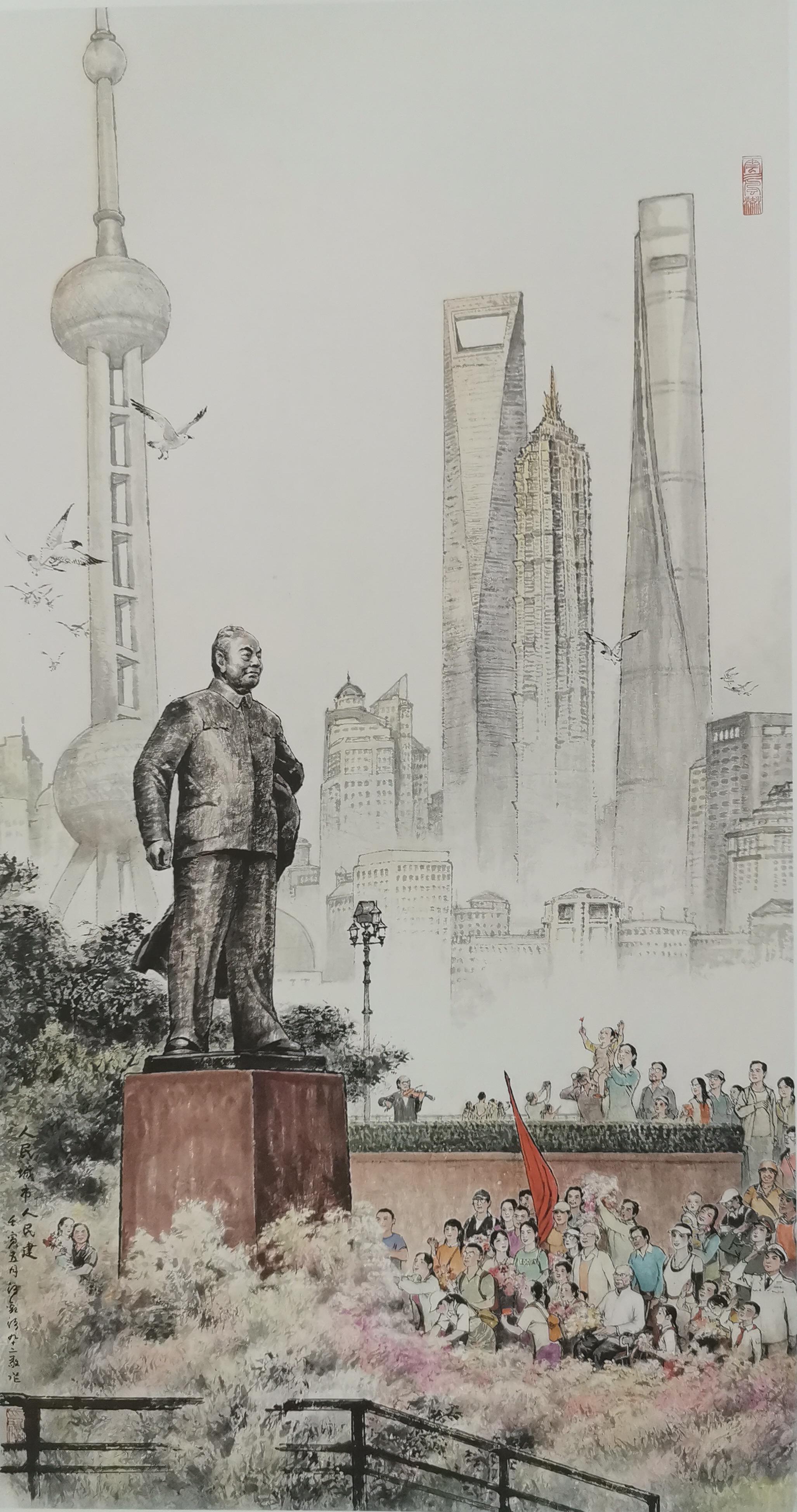 92岁高龄的汪观清是参展艺术家中年龄最大的一位,他带来了精心构思的作品《人民城市人民建》。这幅被挂在展览醒目位置的作品中,各行各业身着盛装的市民欢聚在陈毅像前,身后是体现浦东开发开放成就的标志性建筑,以此表现汪观清对上海未来发展的坚定信心。