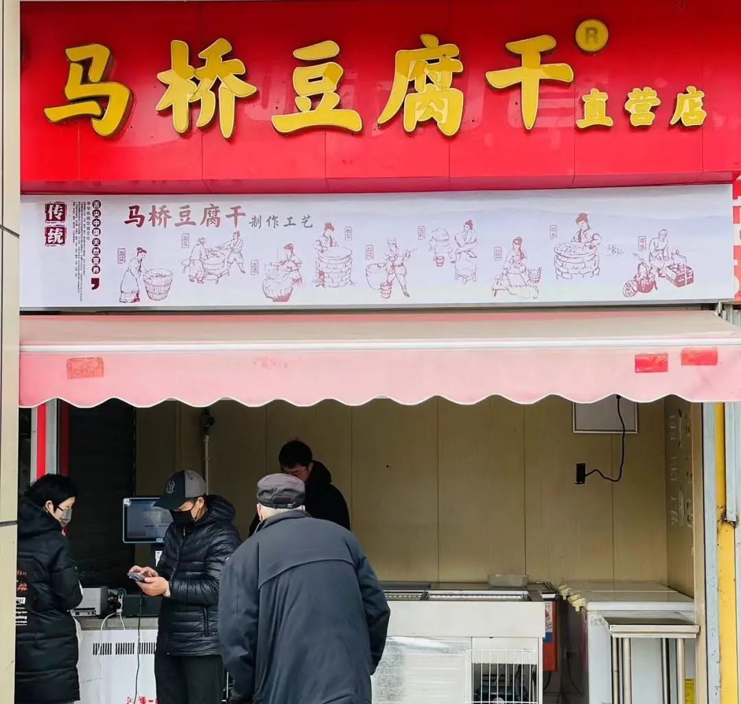 寻着浓郁的豆香,来到马桥豆腐干直营店新店。店招下的一幅幅图片,生动地展示了马桥豆腐干的制作工艺和历史传承。