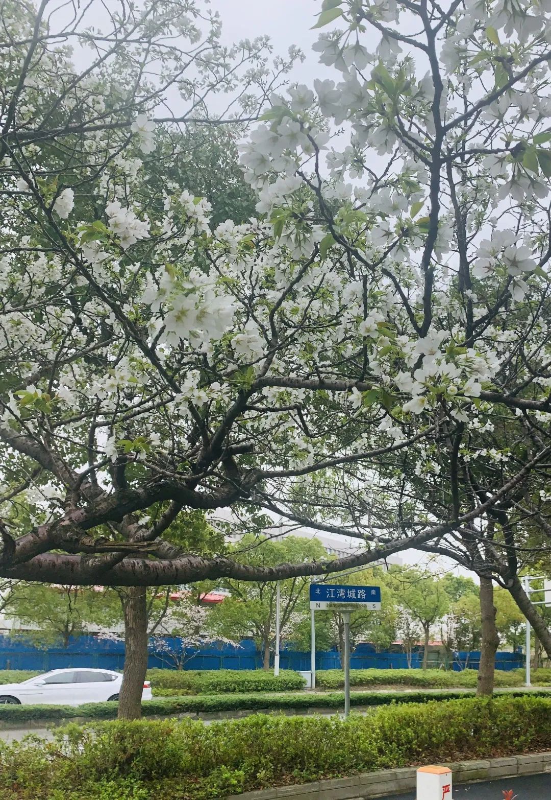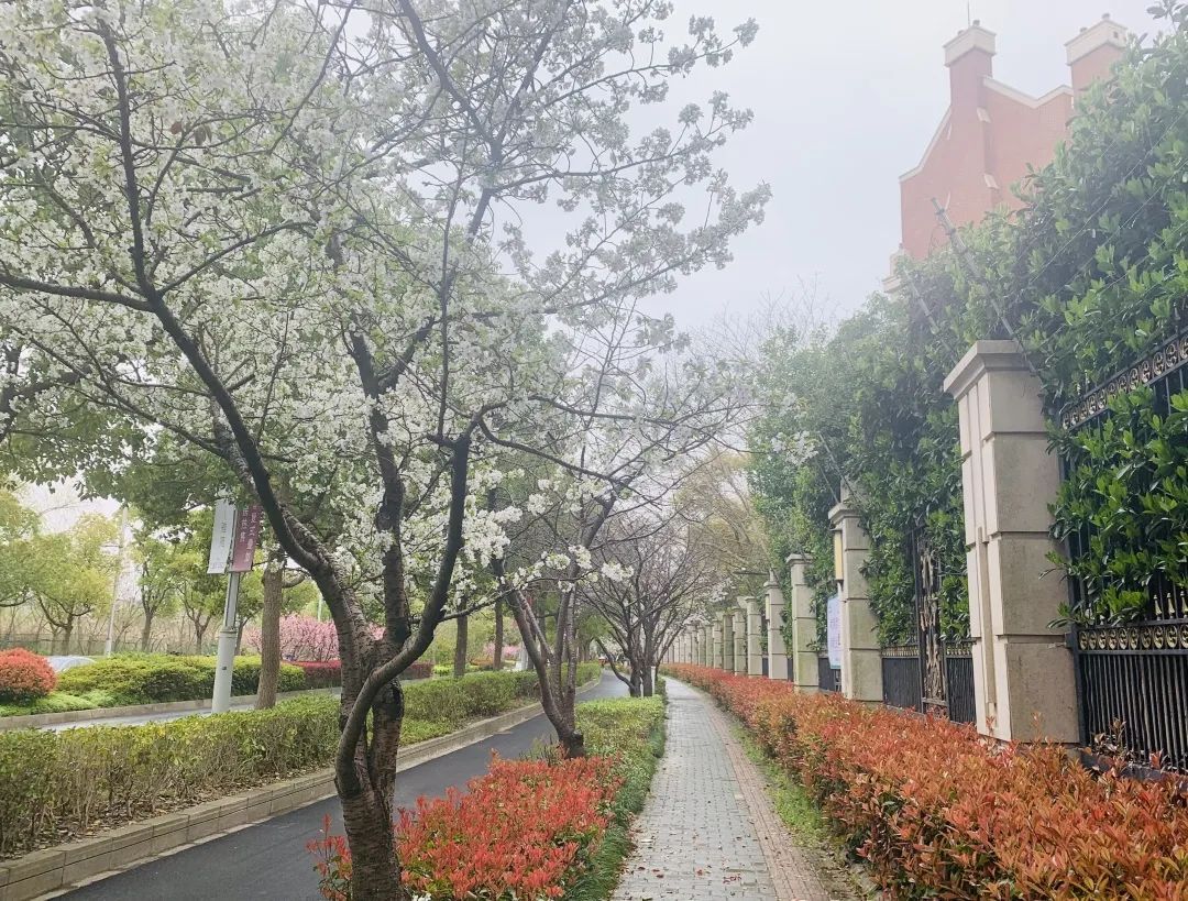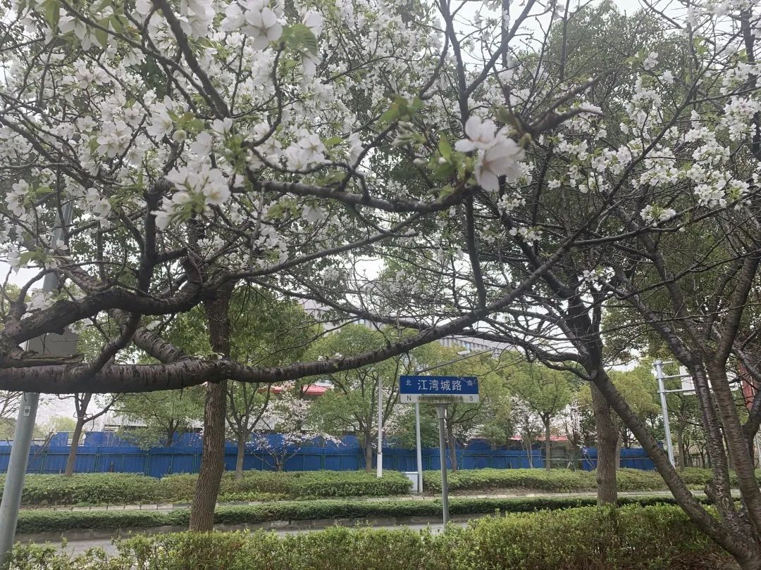 在国帆路江湾城路附近,一簇簇早樱迎风盛放,花瓣小而密,白色或淡粉,俏立枝头,吐露芳香。