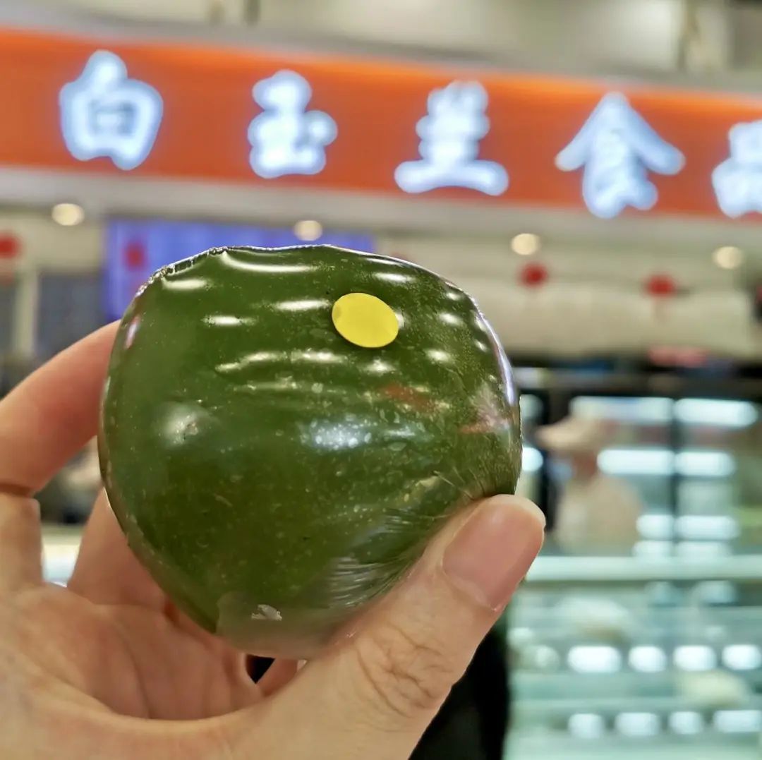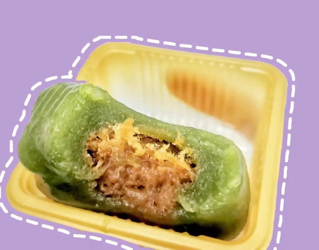 西区老大房家的咸蛋黄肉松味青团,个头偏小,比较适合当小零食吃。馅不算多,但口味比例恰到好处。