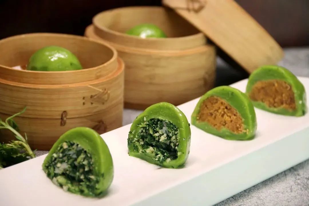 “捣青草为汁,和粉作团,色如碧玉。”今年,东湖宾馆推出了陈皮豆沙、马兰头豆干、蔓越莓豆蓉、咸蛋黄肉松四款口味手工青团。
