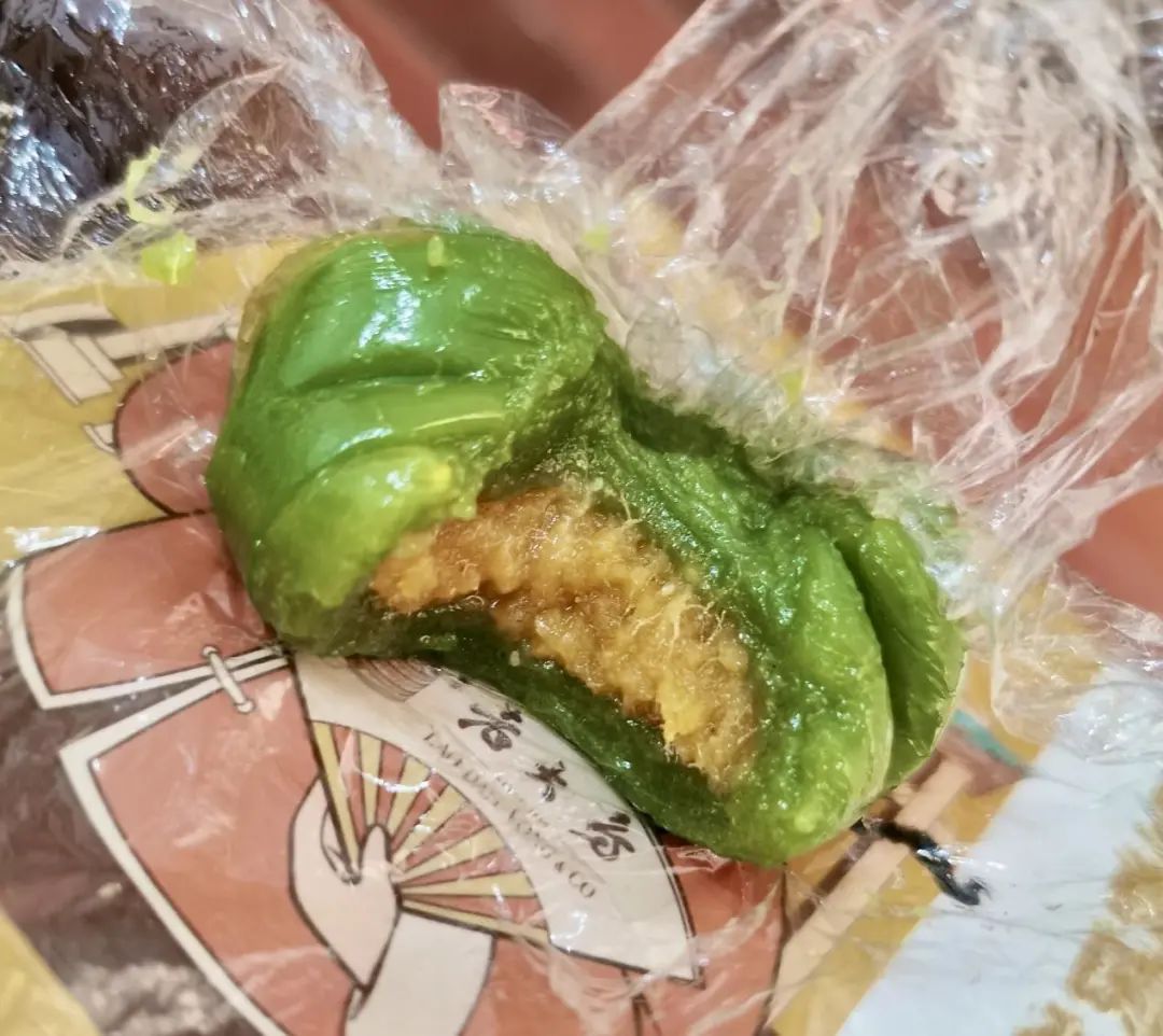 虹口糕团的咸蛋黄肉松青团,连同刚出炉的热气都一同打包装袋~吃起来外皮韧劲较大,不粘牙,馅料中的咸蛋黄与肉松粉被完全搅拌均匀,再用一圈咸蛋黄油包裹,鲜香四溢,口感细腻。