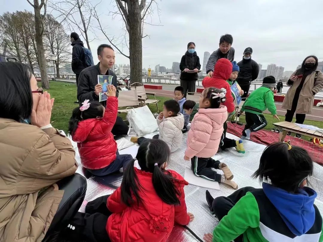 不止在徐汇滨江,在后滩公园,中班小朋友在开展“城市我清洁”公益劳动和街头小采访,并将亲手制作的“地球一小时”宣传卡片送给游客;在徐家汇公园,大班小朋友夜访公园,进行“地球一小时,为爱发声”的环保宣传活动。