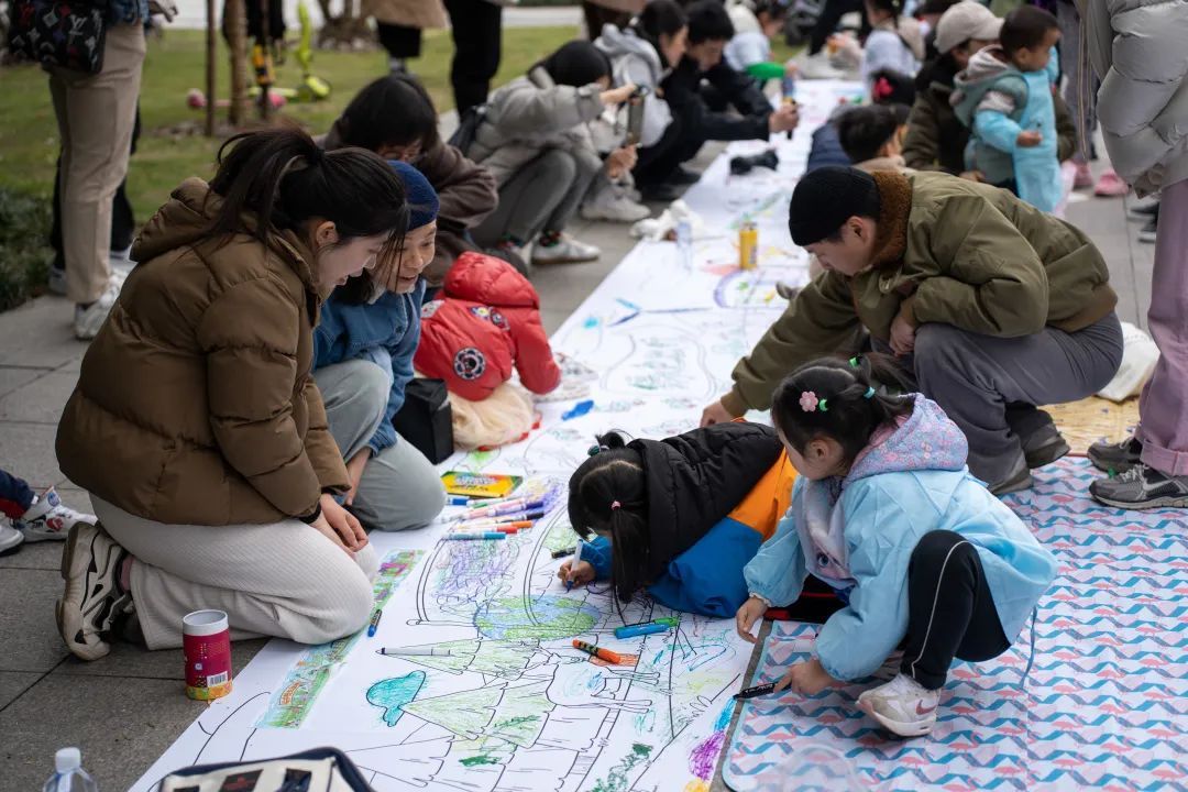 在家长们的带领下,两幅十米长卷在地面上铺展开来,孩子们要用手中的画笔完成涂鸦环保主题的画卷。在完成画卷后,孩子们还拿着横幅和画卷去征集路人的签名,宣传“地球一小时”活动。虽然孩子们还不能使用复杂精准的语言来表达,但他们的举动却格外令路人动容。
