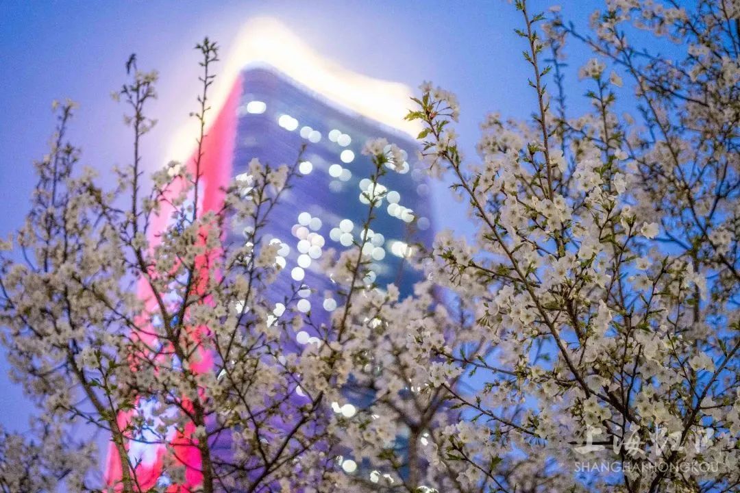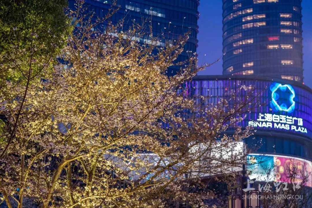 夜幕降临,附近的白玉兰广场灯火璀璨,满树繁花更添梦幻色彩。
